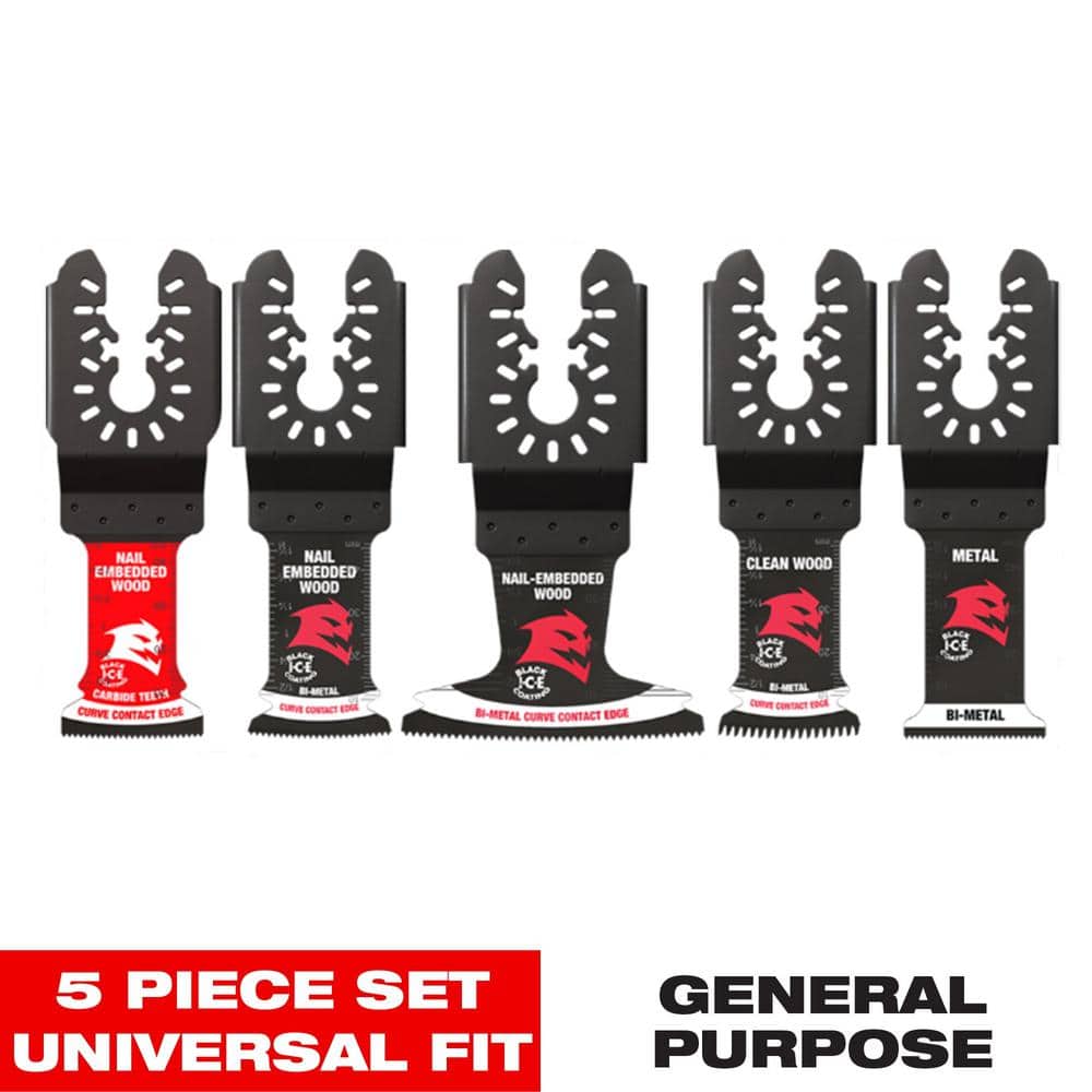 Experience unmatched versatility and cutting excellence with the DIABLO Universal Fit Oscillating Blade Set. Perfect for professionals and DIY enthusiasts, these bi-metal and carbide blades deliver 5X longer life and precise cuts in wood, metal, and plastics. Designed with a curve contact edge and Black I.C.E. coating, this 5-piece set ensures clean, accurate performance.