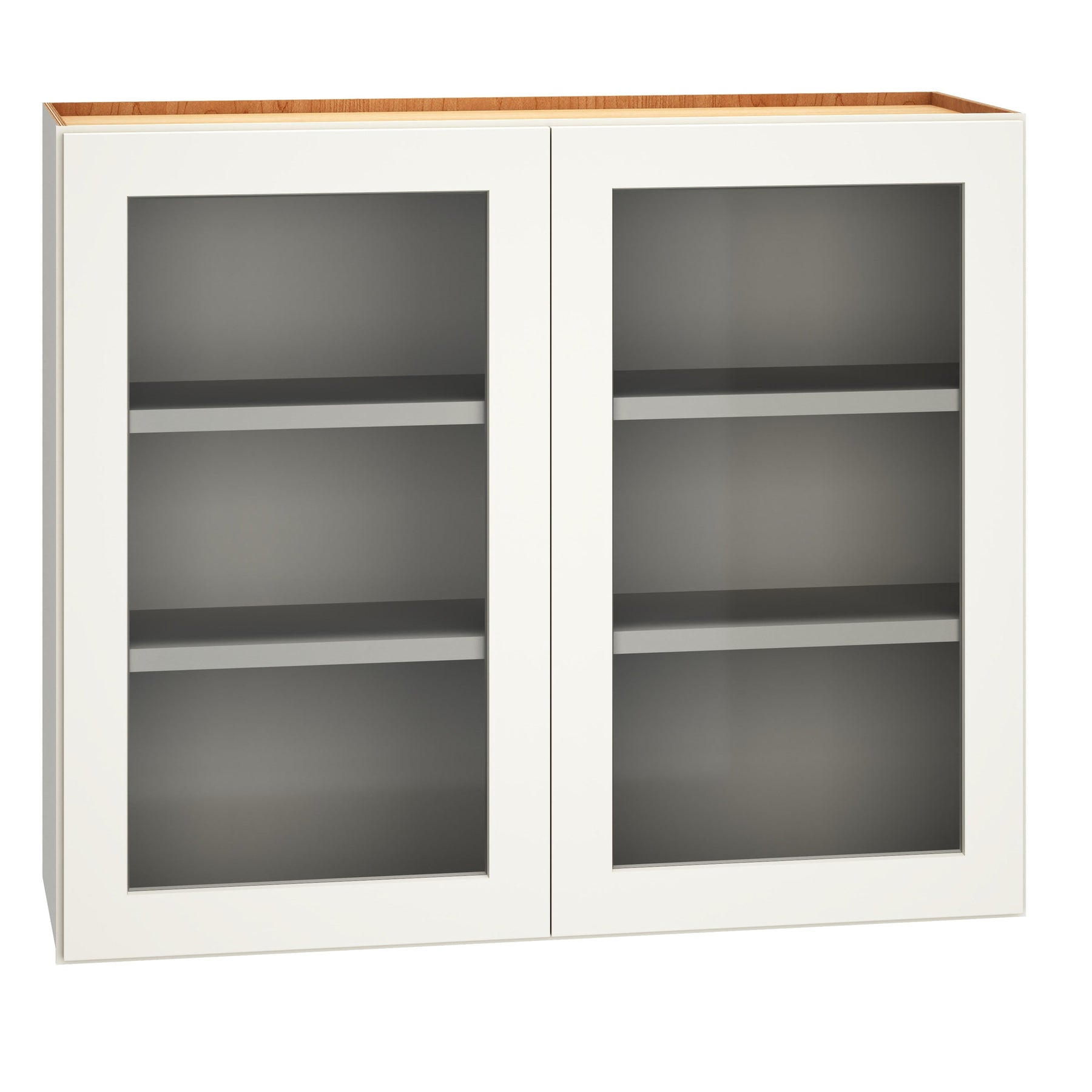 A: No, the cabinet does not include glass fronts. It features traditional recessed panel Shaker doors.