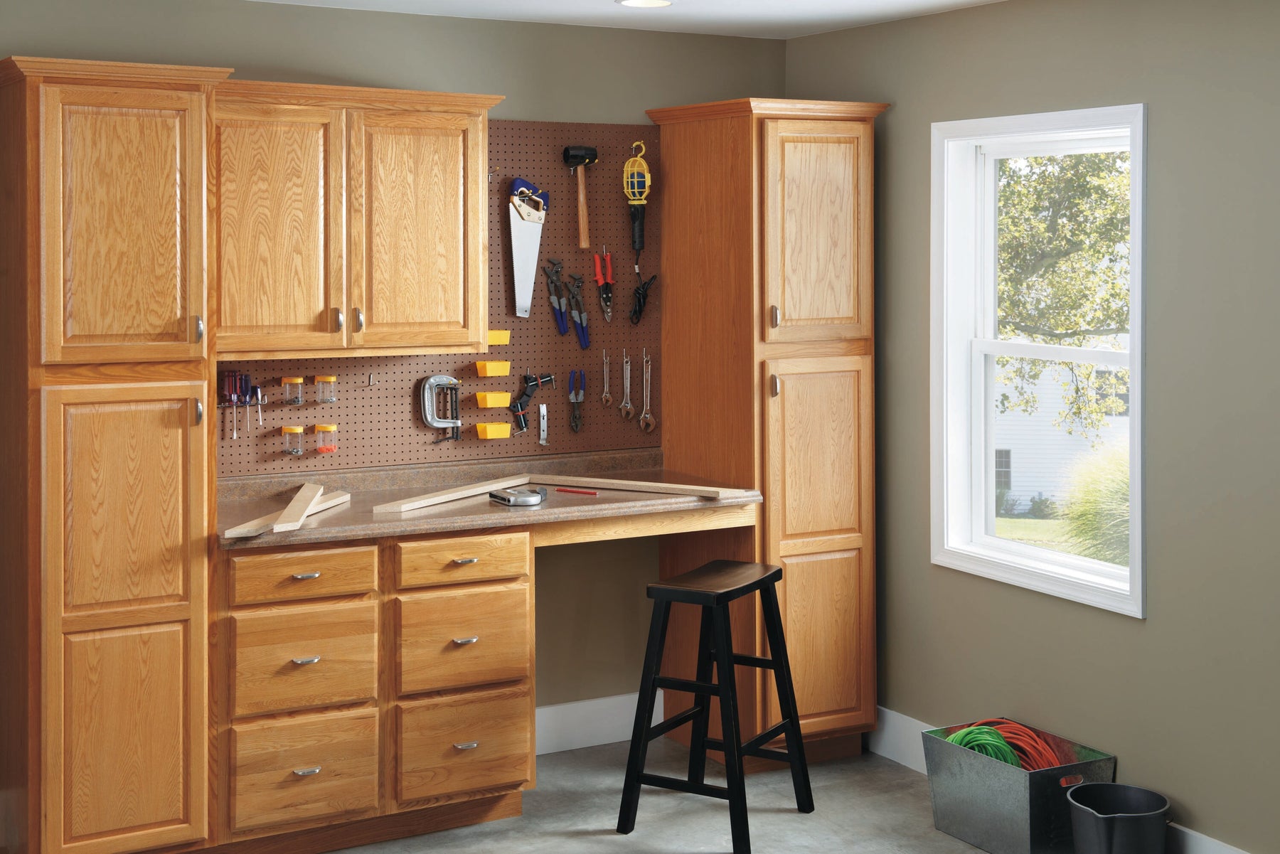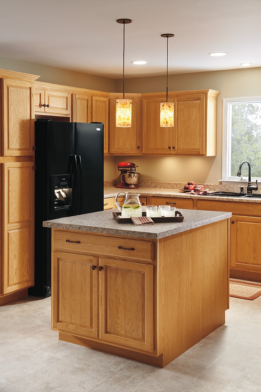 A: Raised-panel doors in a medium brown Wheat finish from the Portland collection.