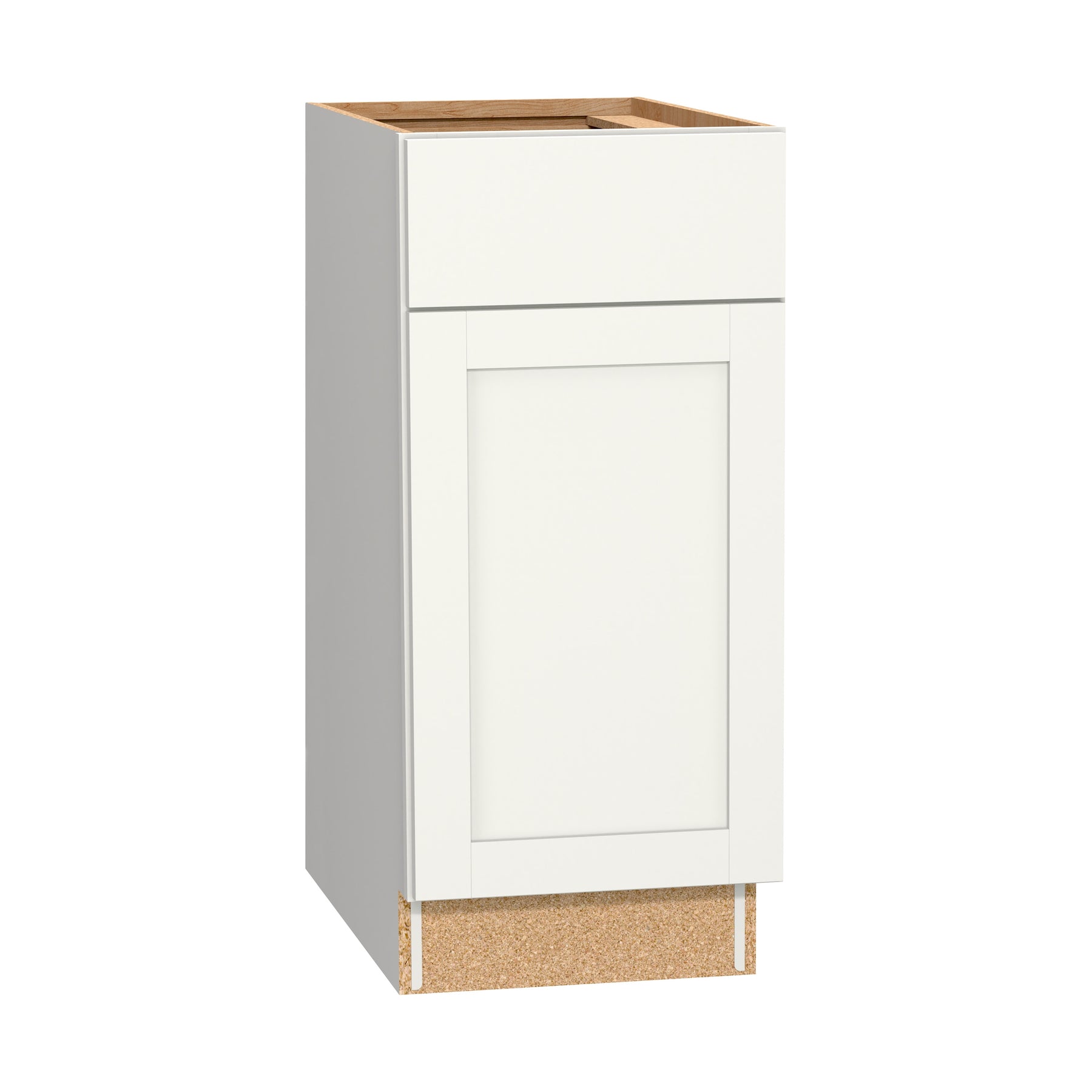 Fully assembled Arcadia base cabinet delivers clean Shaker styling in a durable TrueColor white laminate. Built with furniture board, solid back, and I-beam braces for stability, it includes one drawer, one door, and an adjustable shelf for flexible storage.