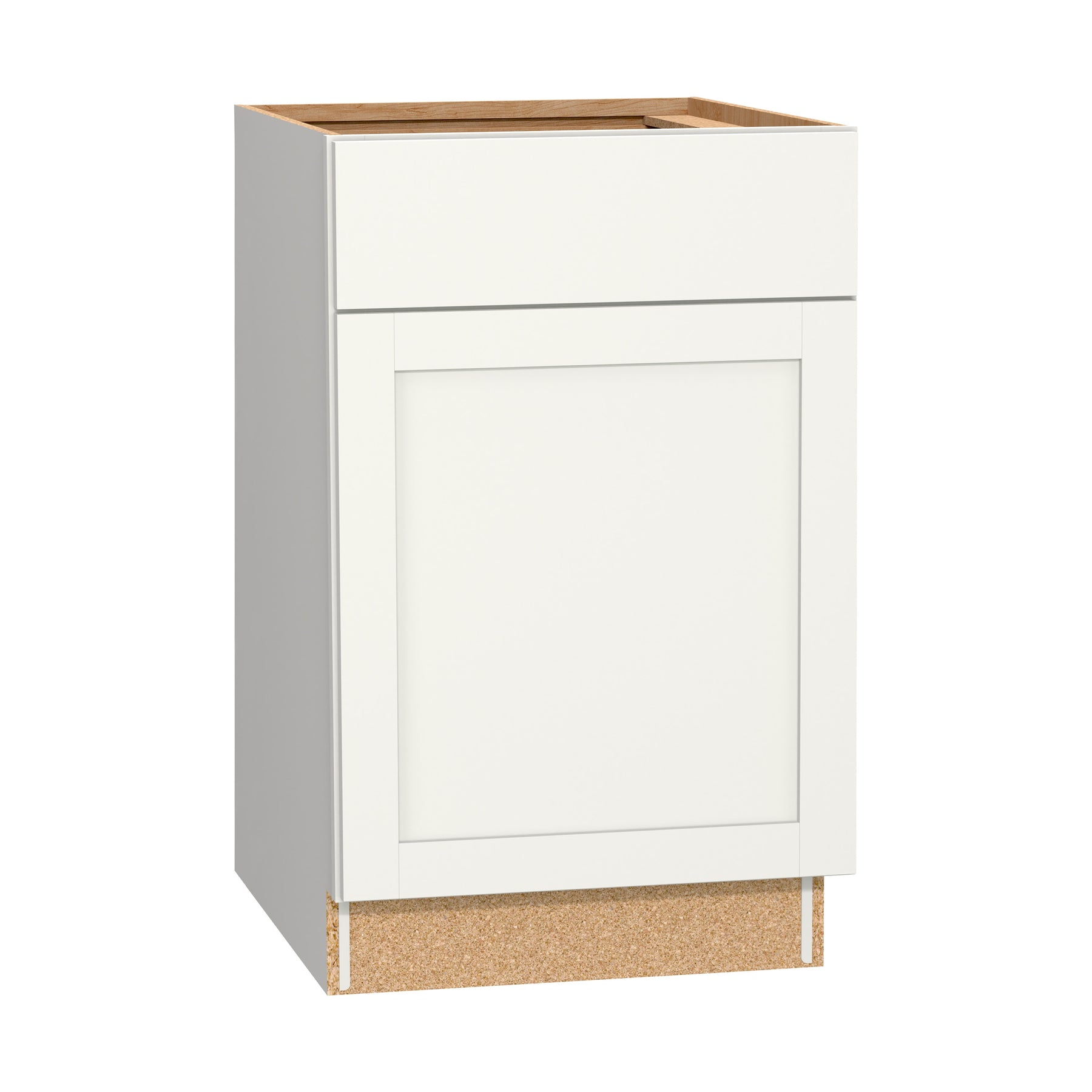 This fully assembled Arcadia base cabinet delivers clean Shaker styling in a durable TrueColor white laminate. Built from engineered wood with a solid back and I-beam braces, it features a full-overlay door, slab drawer front, and an adjustable shelf for flexible storage.