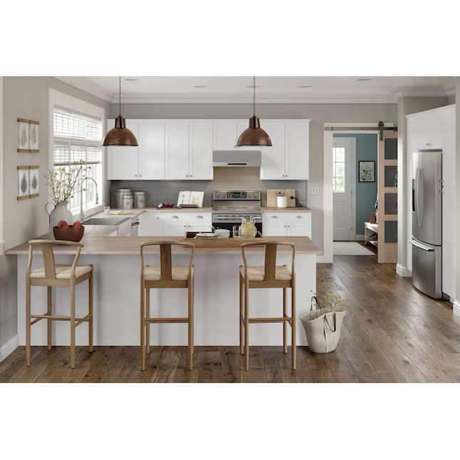 Arcadia’s pure white palette and refined shaker profile instantly freshen a room with calm, contemporary polish. The full-overlay door creates a sleek, uninterrupted rhythm across the wall, making the space feel larger and more curated. Pair with warm wood counters and brass hardware for a layered, modern-classic look. This cabinet is a chic essential that brings everyday luxury to kitchens and laundry rooms alike.