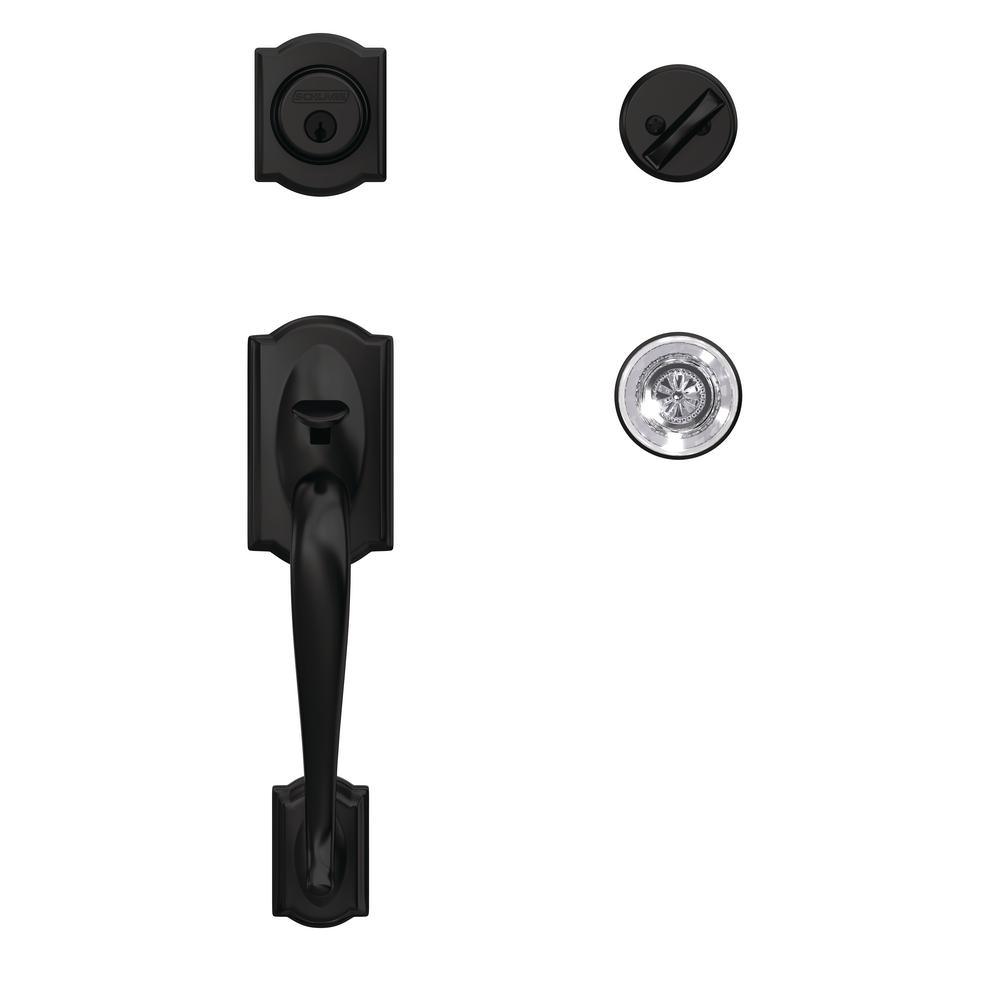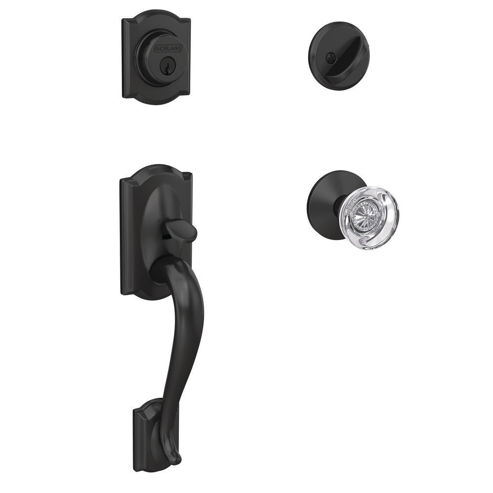 The ultimate in entryway style, the Schlage Custom Camelot Single Cylinder Handle set and Interior Hobson Glass Knob with Kinsler Trim in Matte Black makes your front door unforgettable. Low profile interior trim creates a high-style designer look. The Hobson glass knob is the perfect high-end statement piece for styles ranging from traditional to eclectic transitional, while the Camelot grip's scalloped architectural details make any room charming and approachable. The striking appearance of the Matte Black finish creates an elegant look that's sure to be noticed in any style setting. Coordinate the style and finish of your homes door hardware inside and out by pairing with Schlage Custom interior door hardware.