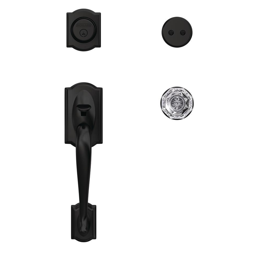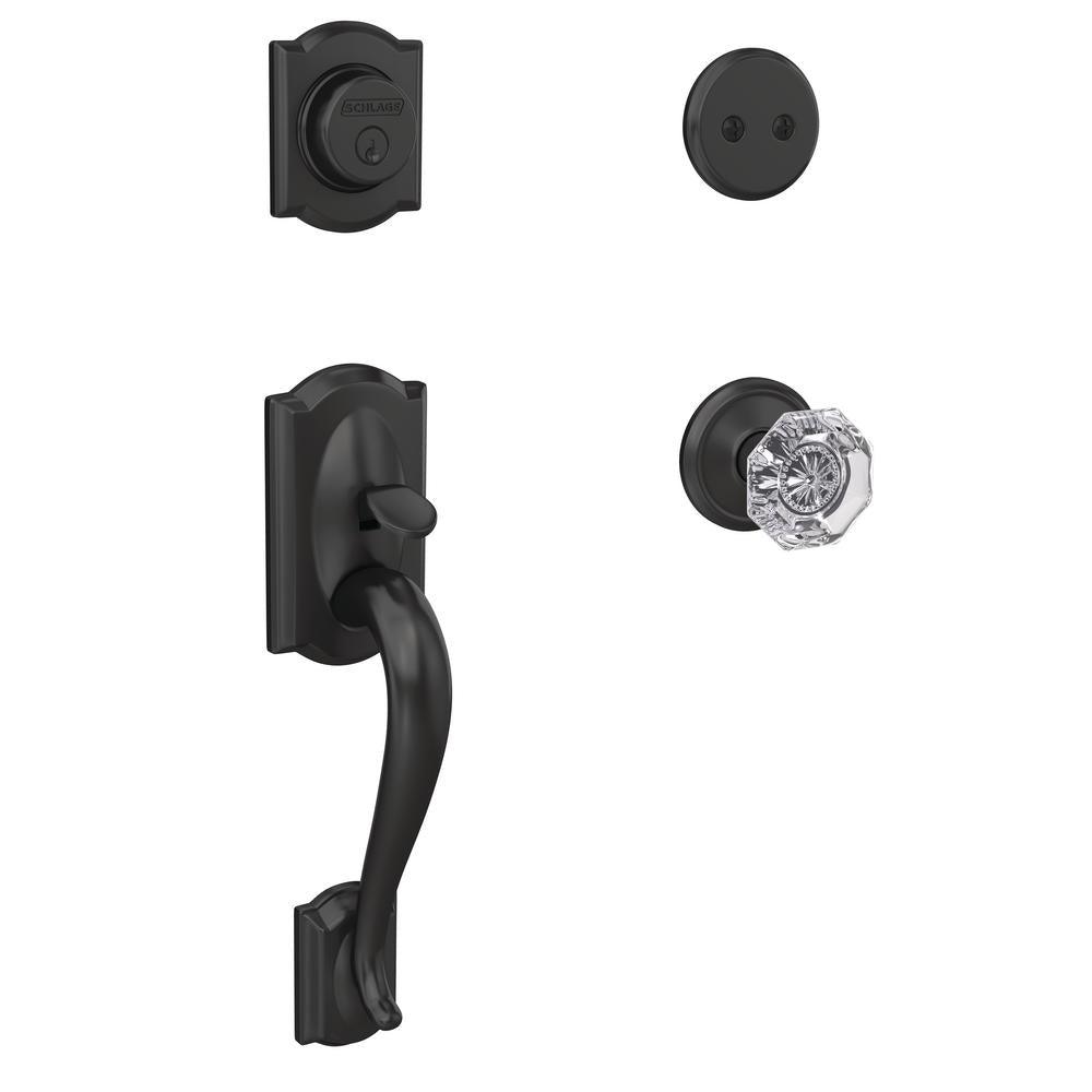 The ultimate in entryway style, the Schlage Custom Camelot Inactive Handle set with Alexandria Glass Knob and Alden Trim in Matte Black is perfect for use as a decorative door pull on a pair of non-latching doors. Low profile interior trim creates a high-style designer look. Inspired by the Victorian era, the Alexandria glass knob is multi-faceted with classic detailing sparkling in the center, while the Camelot trim trim's scalloped architectural details make any room charming and approachable. The striking appearance of the Matte Black finish creates an elegant look that trim's sure to be noticed in any style setting.