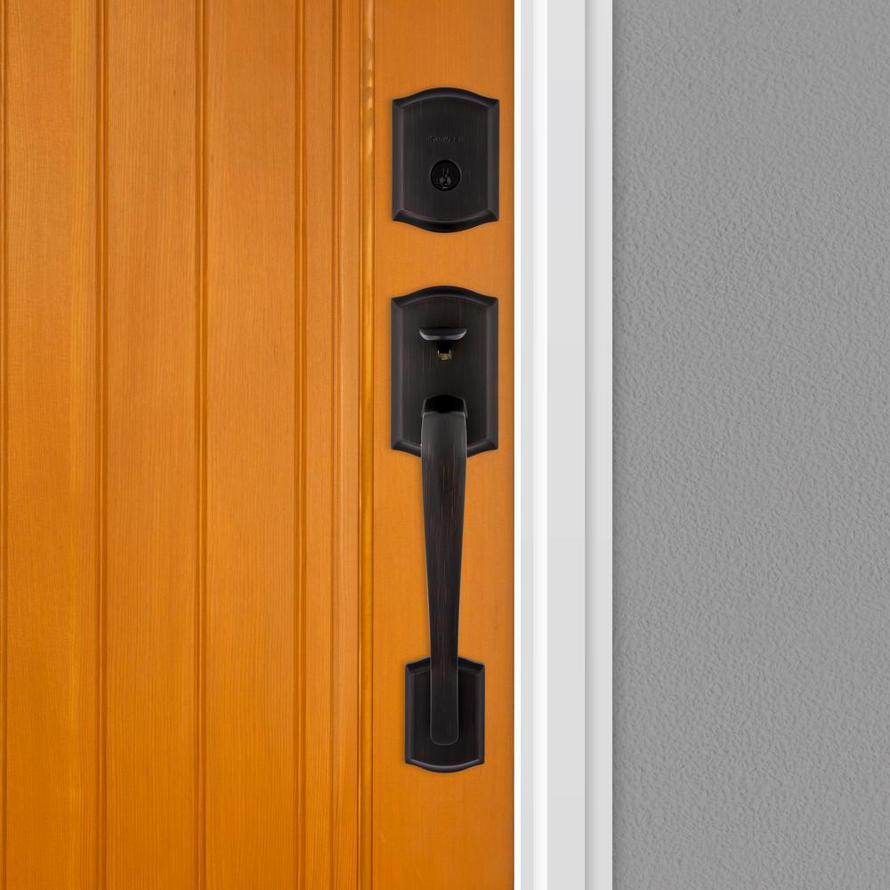 The Prescott handle set has an elegant but modest appearance that will bring charm to any home. With traditional contours that provide an attractive look and comfortable feel when entering the front door. The latch bolt is operated by the thumb piece on the outside and the grip on the inside. The deadbolt is operated by a key on the outside and a thumb turn on the inside. The Venetian Bronze finish is hand-rubbed to reveal unique bronze highlights and provides a rich and warm complement to the product's style.