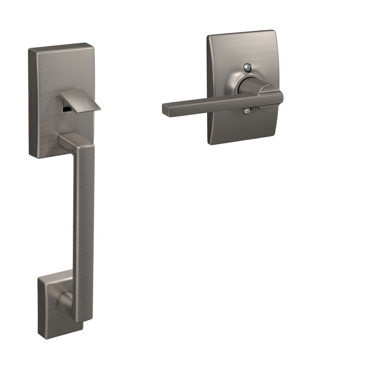 Sleek, modern front entry hardware combining the Century lower half handleset with the Latitude interior lever and Century trim in Satin Nickel. Designed for easy DIY installation and everyday durability, it pairs with a separate deadbolt for secure entry.