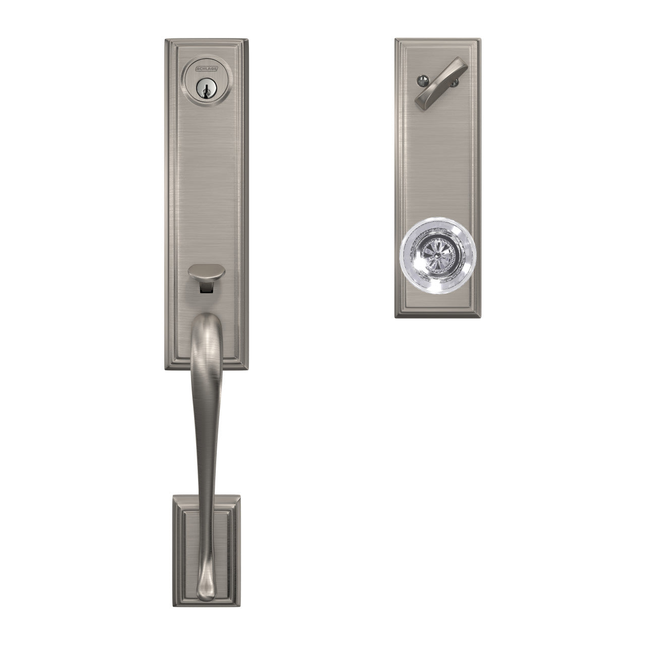 Premium Schlage Custom entry handleset featuring the Addison 3/4 trim and sparkling Hobson glass knob. Built from solid metal with Grade AAA BHMA rating for security, durability, and finish—designed to elevate curb appeal and protect your home.