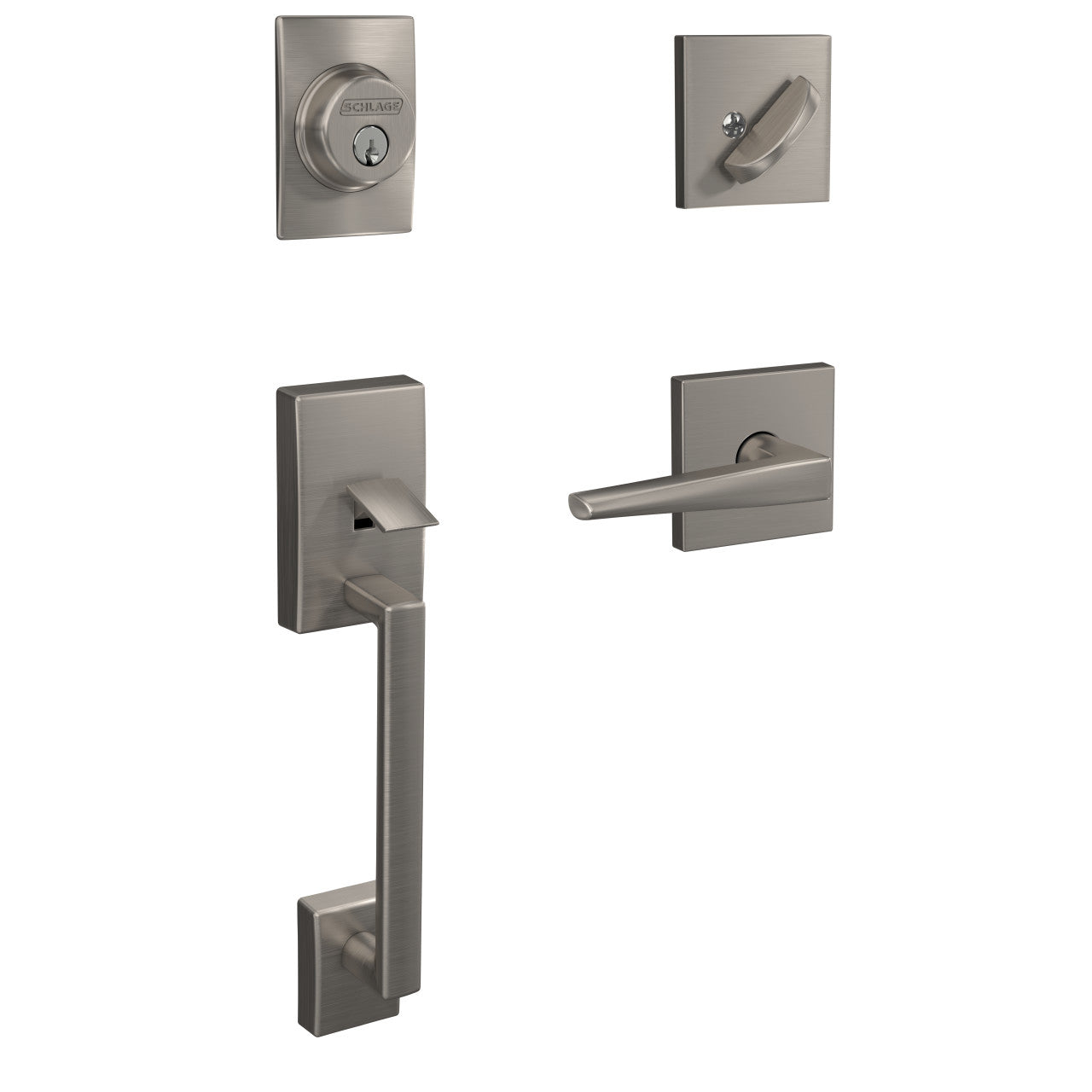 Upgrade your entry with Schlage’s Custom Century single cylinder handleset in satin nickel, paired with the Eller interior lever and Collins square trim. Premium metal construction and Grade AAA BHMA certification deliver stylish security for front doors.