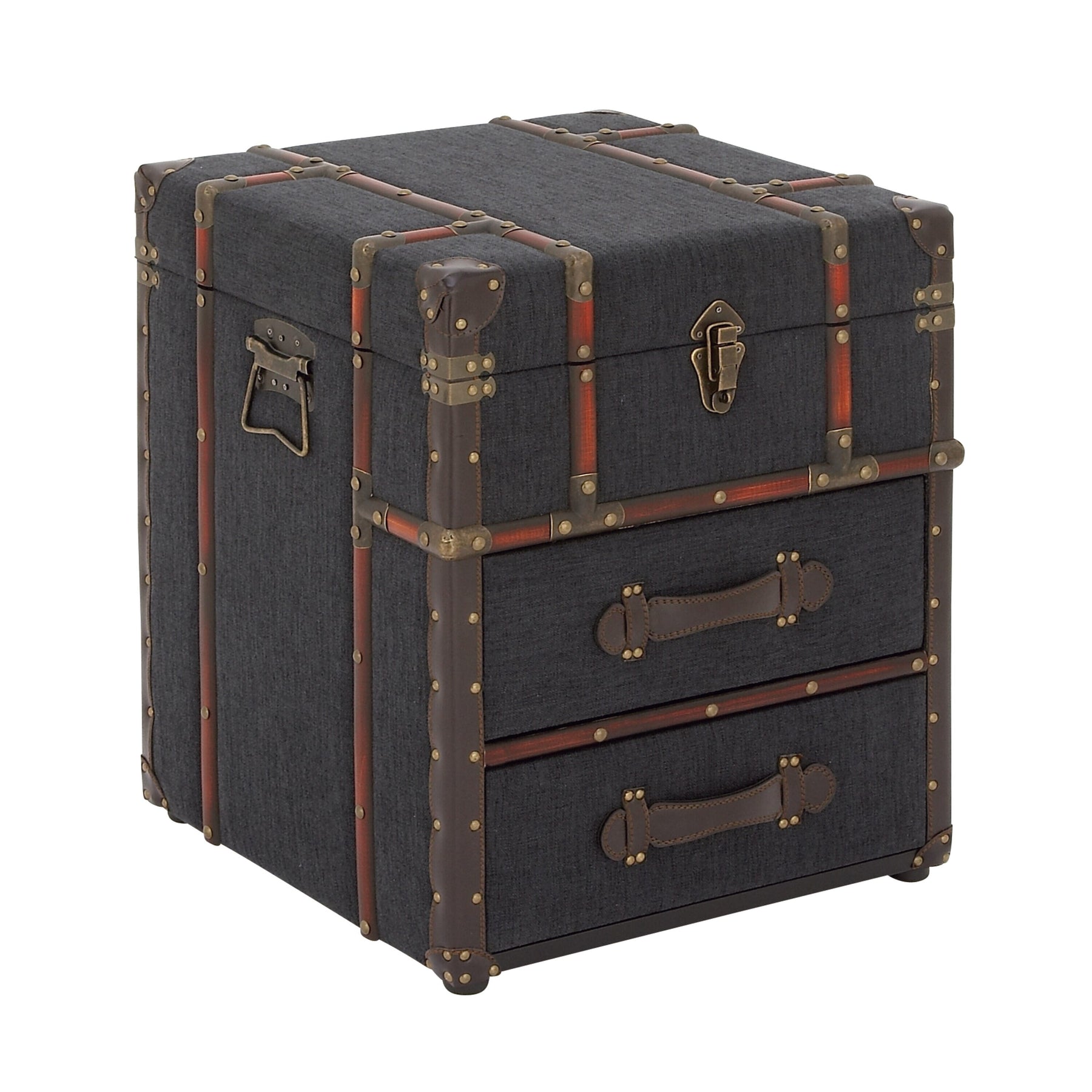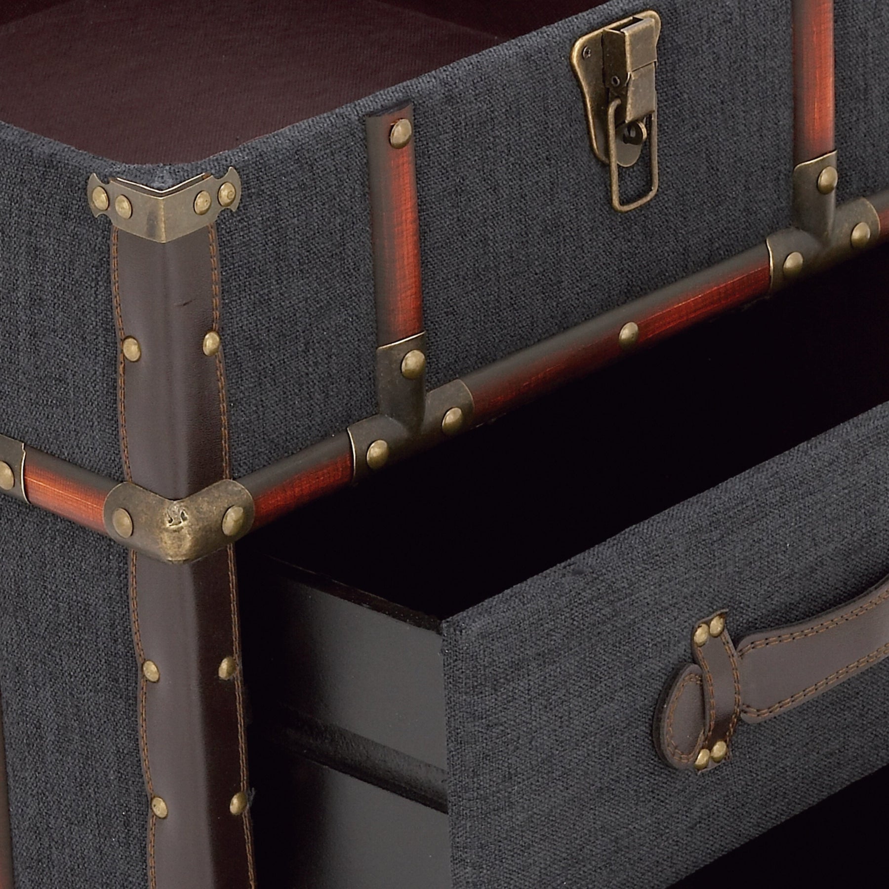 Elevate your interiors with the Grayson Lane Blue Upholstered 2-Drawer Accent Chest, featuring timeless sophistication with its dark navy fabric and vintage-inspired design. This elegant piece doubles as a storage solution, combining form and function with its buckle hinged top and bolted leather straps.