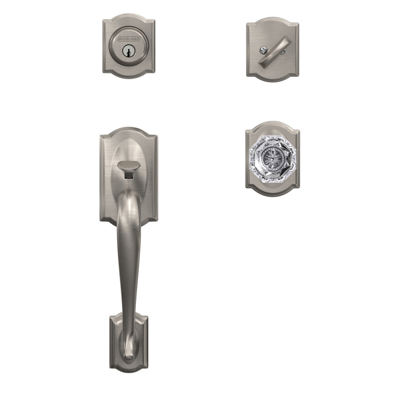 Elevate your entry with the Schlage Custom Camelot single cylinder handleset featuring the sparkling Alexandria glass knob and matching Camelot trim. Built from premium metal and BHMA Grade AAA certified, it delivers refined style with advanced security for everyday peace of mind.