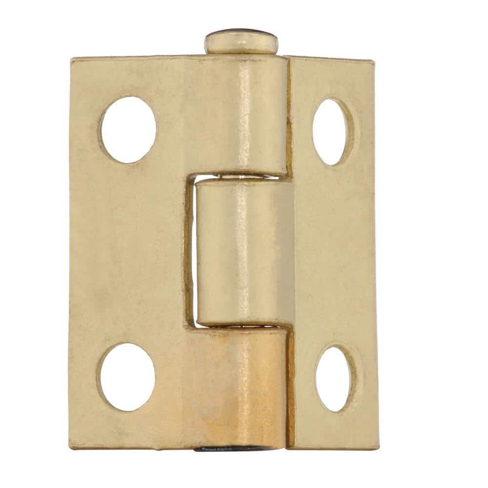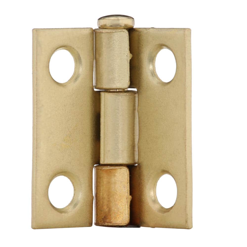 Compact steel utility hinges with a satin brass finish, designed for mortise installation on small doors, cabinets, or boxes. A fixed, non-removable pin enhances security, and mounting screws are included for quick setup.