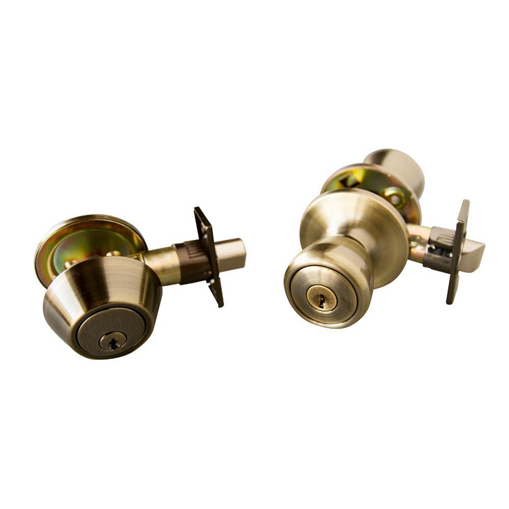 • This entry knob and deadbolt combo accepts a key on the outside, and each are operated by a turn-button on the inside