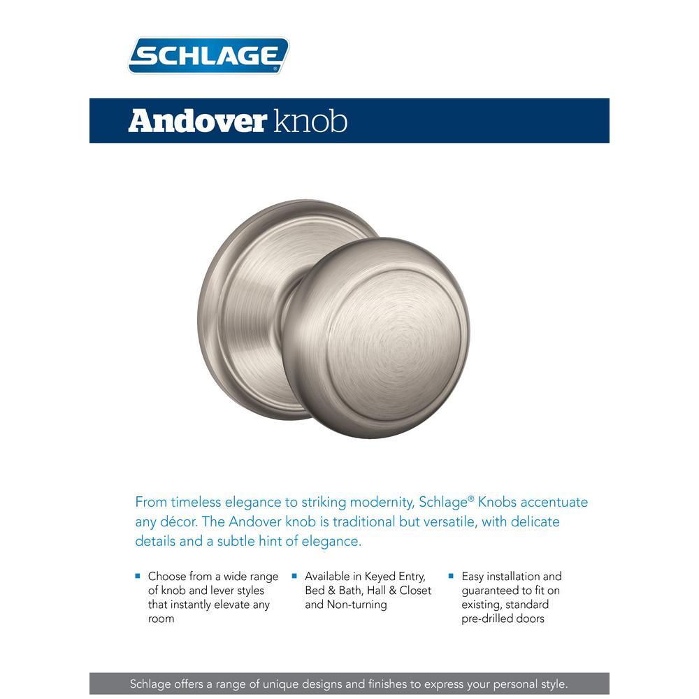 The Schlage Andover Aged Bronze Passage Door Knob with Addison Trim is perfect for use on hall and closet doors where locking is not needed. The Andover knob is traditional but versatile, with delicate details and subtle hint of elegance, while the Addison trim's distinguished look incorporates subtle details without losing its classic simplicity. Our Aged Bronze finish is inspired by traditional design, featuring warm, copper tones that break through its darker, aged exterior. The universal design of this passage door knob set allows it to be mounted to left or right swing doors. Plus, it's been designed and tested with strength and durability in mind.