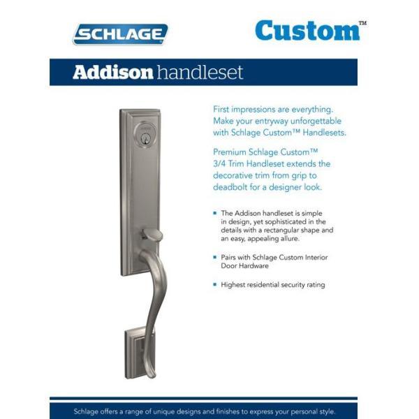 The ultimate in entryway style, the Schlage Custom Addison 3/4 in. Trim Single Cylinder Handle set with Alexandria Glass Knob (Aged Bronze) makes your front door unforgettable. Extended 3/4 in. trim from grip to deadbolt creates a high-style designer look. Inspired by the Victorian era, the Alexandria glass knob is multi-faceted with classic detailing sparkling in the center, while the Addison trims distinguished look incorporates subtle details without losing its classic simplicity. The Aged Bronze finish is inspired by traditional design, featuring warm, copper tones that break through its darker, aged exterior. Coordinate the style and finish of your homes door hardware inside and out by pairing with Schlage Custom interior door hardware.