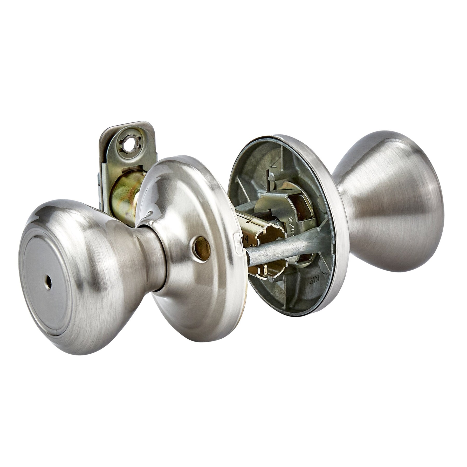 The Kwikset Cameron privacy knob brings traditional style and dependable performance to interior bed and bath doors. Finished in satin nickel, it features an ANSI/BHMA Grade 2 certified lock, adjustable backset, and universal handing for quick, screwdriver-only installation.