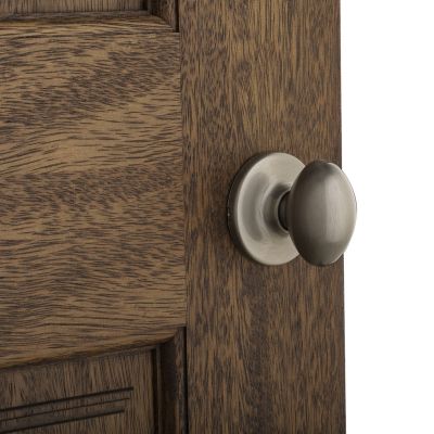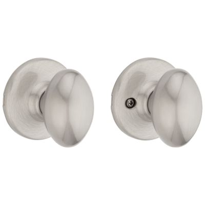 A traditional, non-locking door knob for hallways and closets, finished in satin nickel. Designed for universal handing with adjustable backset for quick, tool-only installation.
