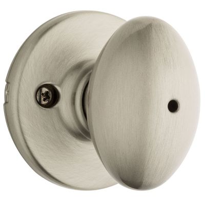 A bed/bath privacy knob in a satin nickel finish designed for interior doors. Universal handing and an adjustable latch allow quick, screwdriver-only installation while delivering reliable ANSI/BHMA Grade 3 performance.
