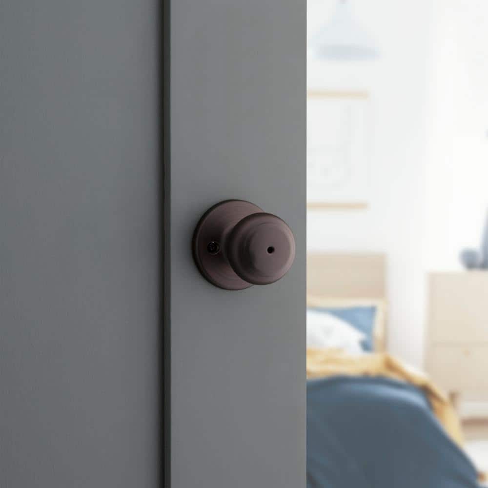 The Kwikset Cove privacy knob delivers classic style and dependable function for bedrooms and bathrooms. Finished in hand-rubbed Venetian Bronze, it installs in minutes and features an interior turn piece with emergency access from the outside.