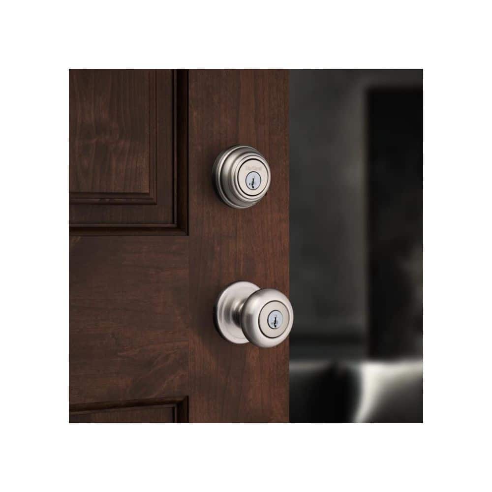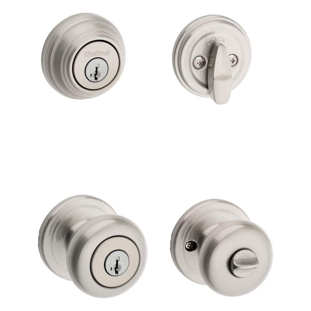 Secure your exterior door with the Kwikset Juno combo pack, pairing a classic round entry knob with a single-cylinder deadbolt. SmartKey Security lets you re-key in seconds, while the satin nickel finish and Microban protection offer style and a cleaner surface.