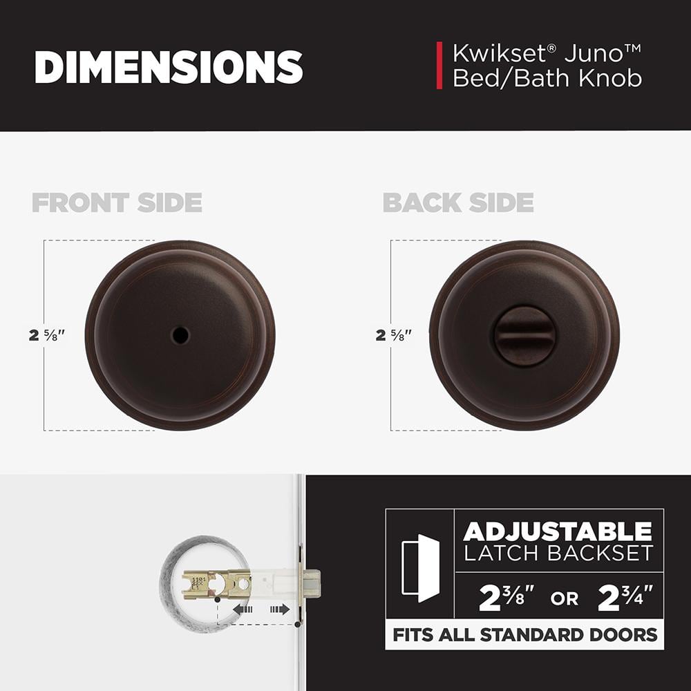 The Kwikset Juno privacy door knob offers classic style with dependable performance for bedrooms and bathrooms. Its all-metal construction, adjustable latch, and ANSI/BHMA Grade 2 rating deliver durability and smooth operation, while the Venetian Bronze finish adds a warm, transitional touch.