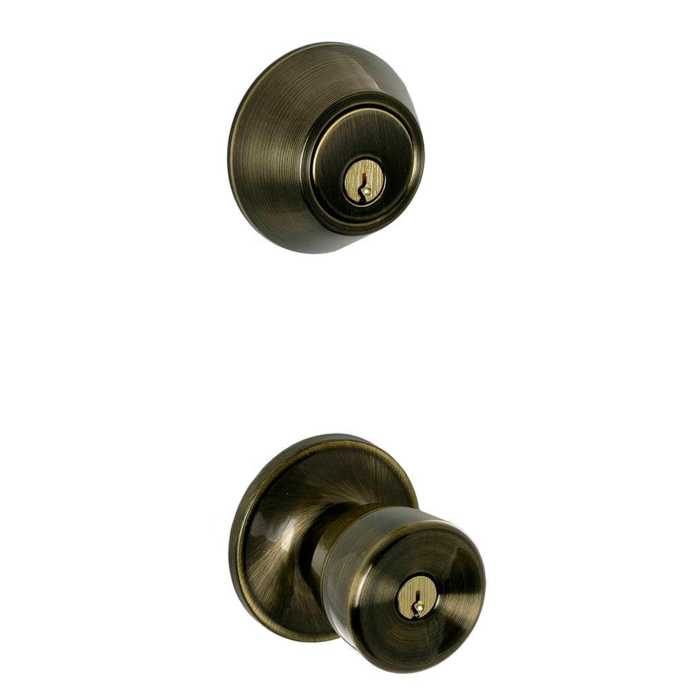 Secure your exterior door with the ESSENTIALS by Schlage Brill combo, pairing a single cylinder deadbolt with a keyed entry knob in antique brass. Designed to fit standard doors, it installs in minutes with a screwdriver and comes keyed alike for convenience and everyday durability.