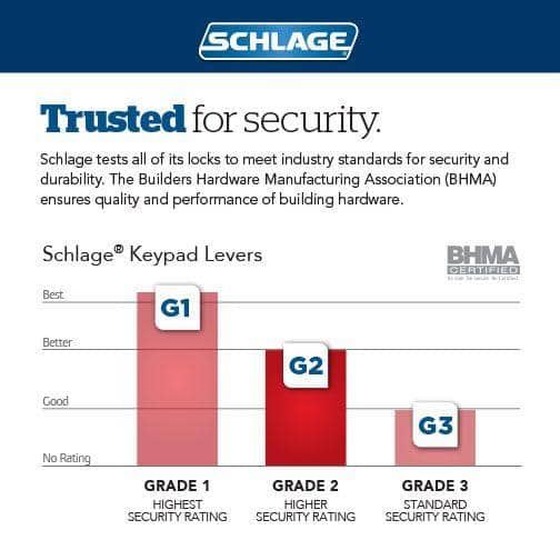 A: BHMA/ANSI Grade 2 for higher residential security.