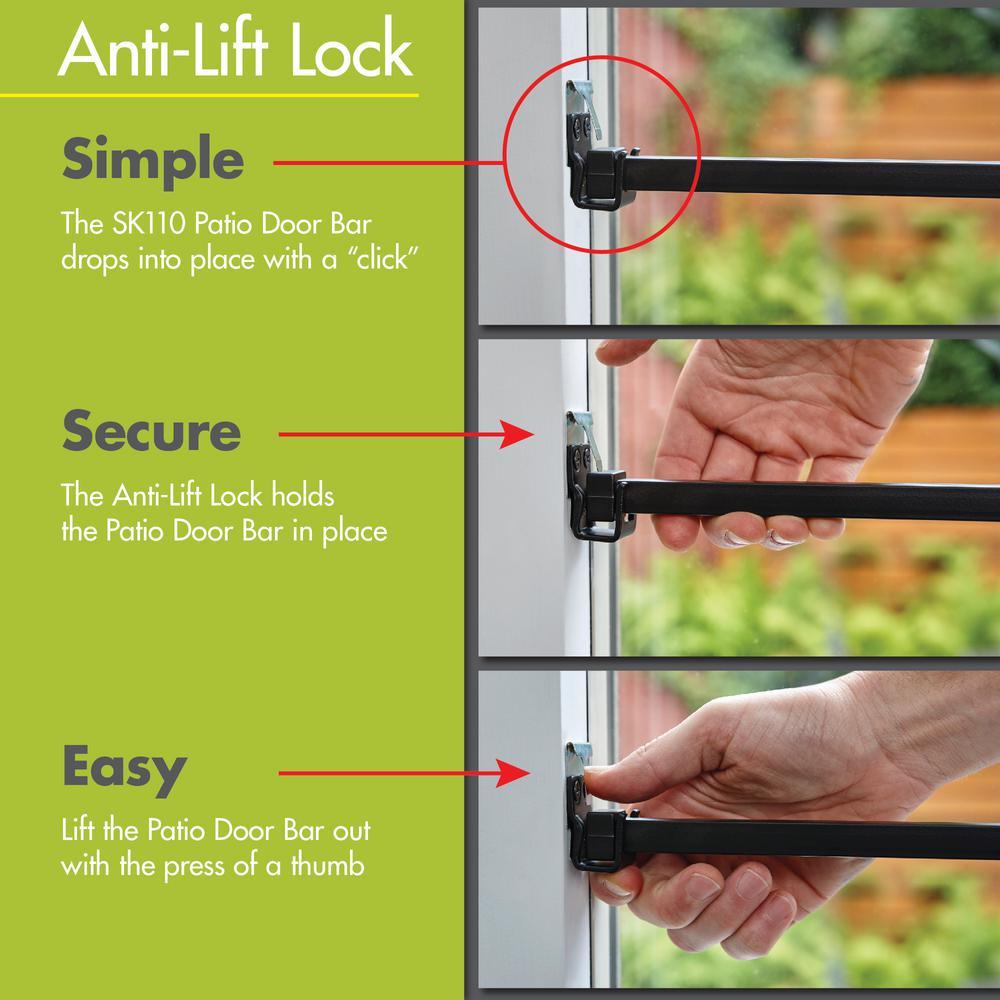 Recently chosen as ""The best sliding door security bar" according to Business Insider! (http://www.businessinsider.com/best-diy-home-security-products/#the-best-sliding-door-security-bar-6) NEW! Childproof Anti-Lift Lock: We've listened to your feedback and added an optional clip that sits behind the saddle. This prevents children from raising the bar and getting outside and protects against potential intrusion when the door is locked in an open position. No more bending down: Because the bar is mounted at arm height, you won’t have to bend down every time you want to open the door. One-touch adjustability for ventilation: The bar can be easily adjusted and locked at any width, so you can lock your door in a slightly open position, staying safe while still letting in fresh air. Easy to install: Adjustable from 25-3/4 in. to 47-1/2 in. wide, the SK110 will easily fit most doors, so it can be installed with no cutting.