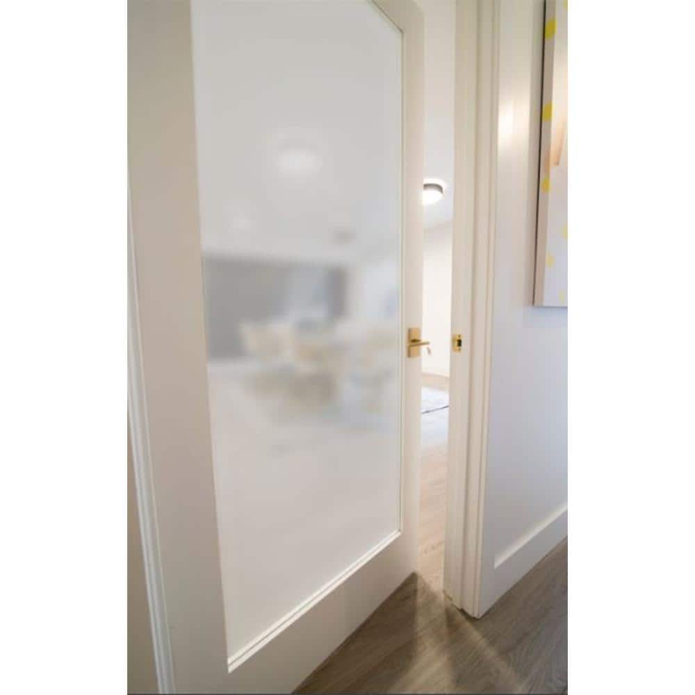 Across retailer reviews, buyers praise the door’s modern look and the satin-etched glass that balances light with privacy. Many note the primed finish takes paint well and the solid-core build feels sturdy with good sound dampening. A few report that the slab arrives without boreholes as expected and may require professional boring or trimming for best results; occasional comments mention minor shipping dings that required touch-up. Representative quotes: “Lets in light but you can’t see through,” “Heavy, substantial door—quiets the room,” and “Arrived primed and painted beautifully, but plan on boring your own handle.”
