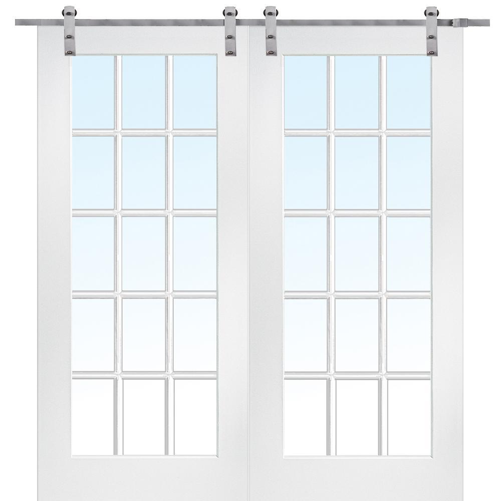 MMI Door Interior French Doors come with tempered glass for extra strength and safety. Each individual pane of glass contains a 1 in. stamp etched into the glass. The Finished opening width is suggested to be 4 in. smaller than the door width provided. This allows 2 in. door overlap per side. The suggested Finished Opening Height can vary depending on thickness of existing trim and can not exceed 82-1/4 in., please see the Installation Instructions provided under Info and Guides for guidance. Our double barn door unit comes with (2) 78-3/4 in. Tracks, (2) 78-1/4 in. mounting boards, (2) Doors Slabs and Track Joiner. Assembly Required and handle sets not included.