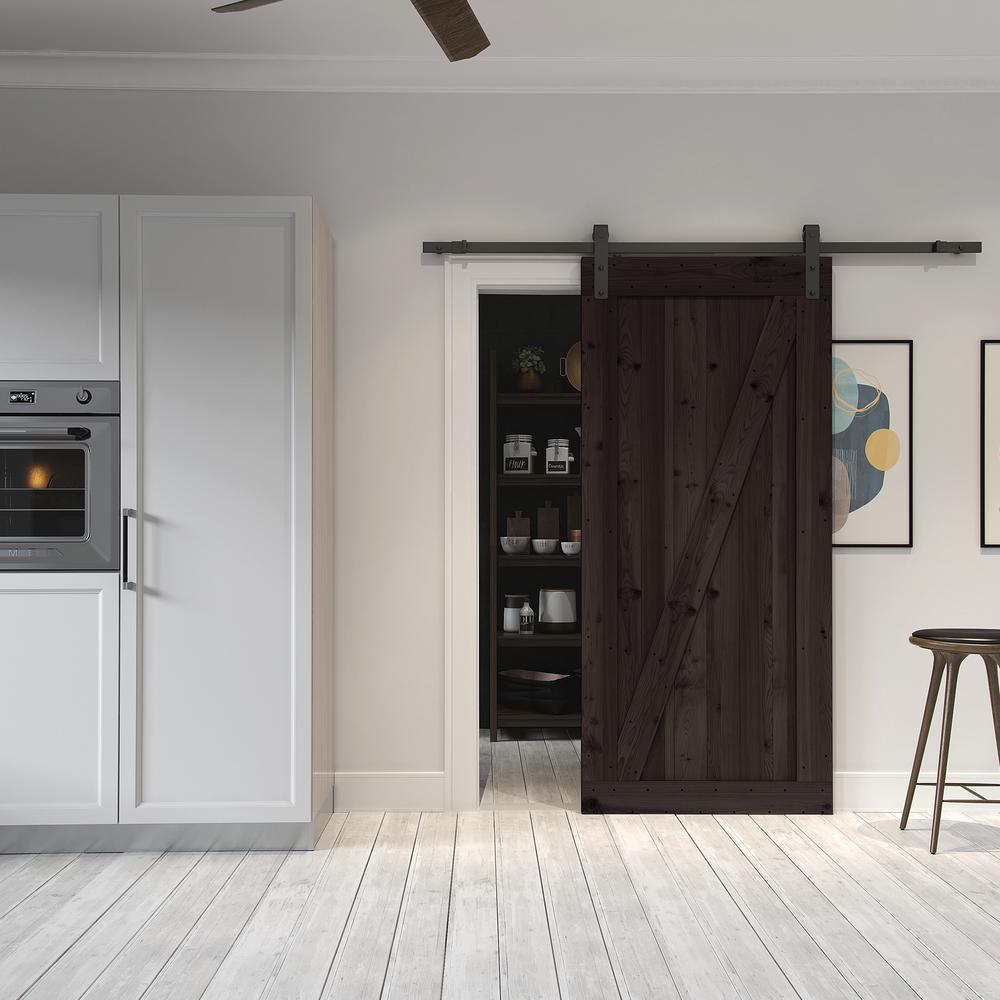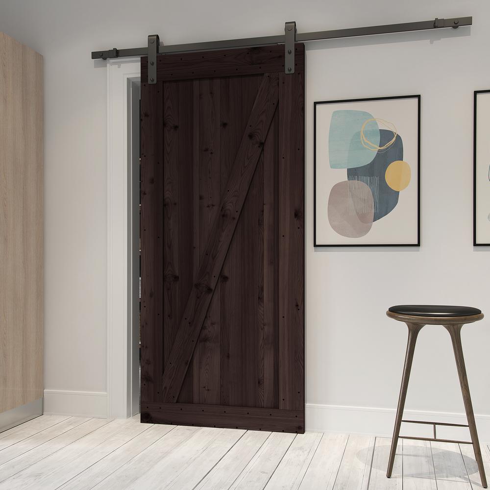 Upgrade your homes interior with this farm style sliding wooden door. The traditional frame with a diagonal brace and dark metal hardware will make your room look like something out of a magazine. Entirely made from quality Canadian Hemlock. This chic piece will be the highlight of your room for many years.