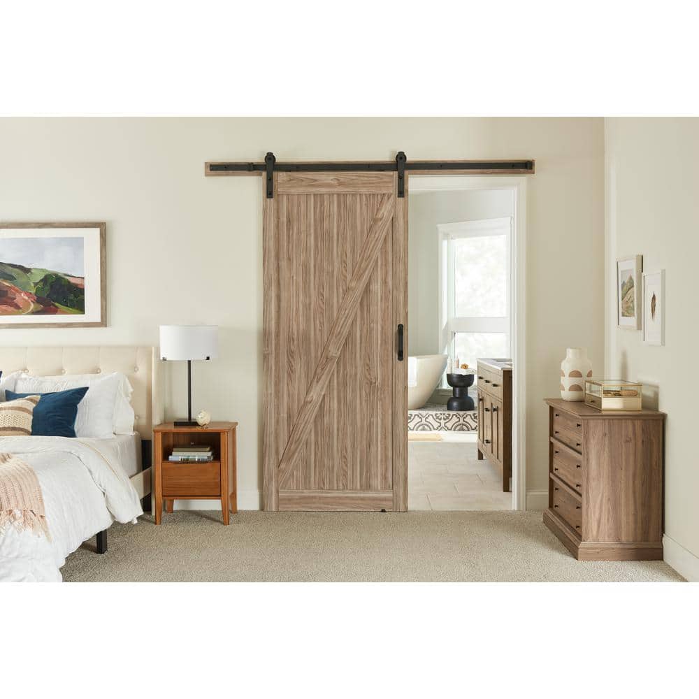 Upgrade your space with this Masonite composite sliding barn door kit featuring a Z-Bar design in Ash Gray. The 36 x 84 in. door glides smoothly on a black track and includes all hardware for quick installation, delivering a space-saving, stylish solution for closets, baths, pantries and more.
