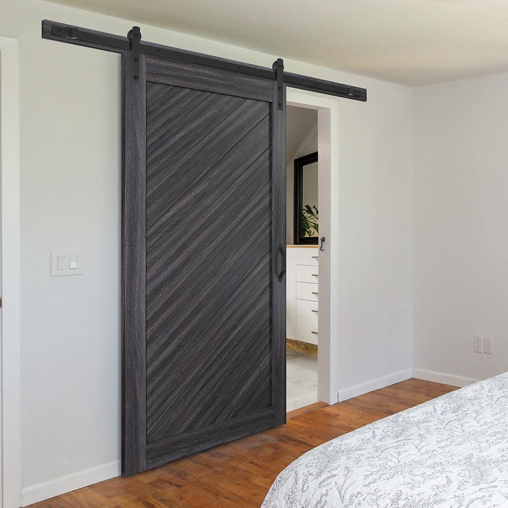 Elevate your space with Masonite’s 36 in. x 84 in. Diagonal Stormy Gray sliding barn door. The solid MDF-core door glides smoothly on a black hardware track to save space while creating a striking focal point. Includes handle, hardware, and instructions for quick installation.