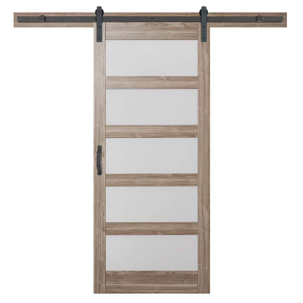 Masonite 36 in. x 84 in. 5 Equal Lites Frosted Glass Ash Gray Interior Sliding Barn Door Slab with Hardware Kit