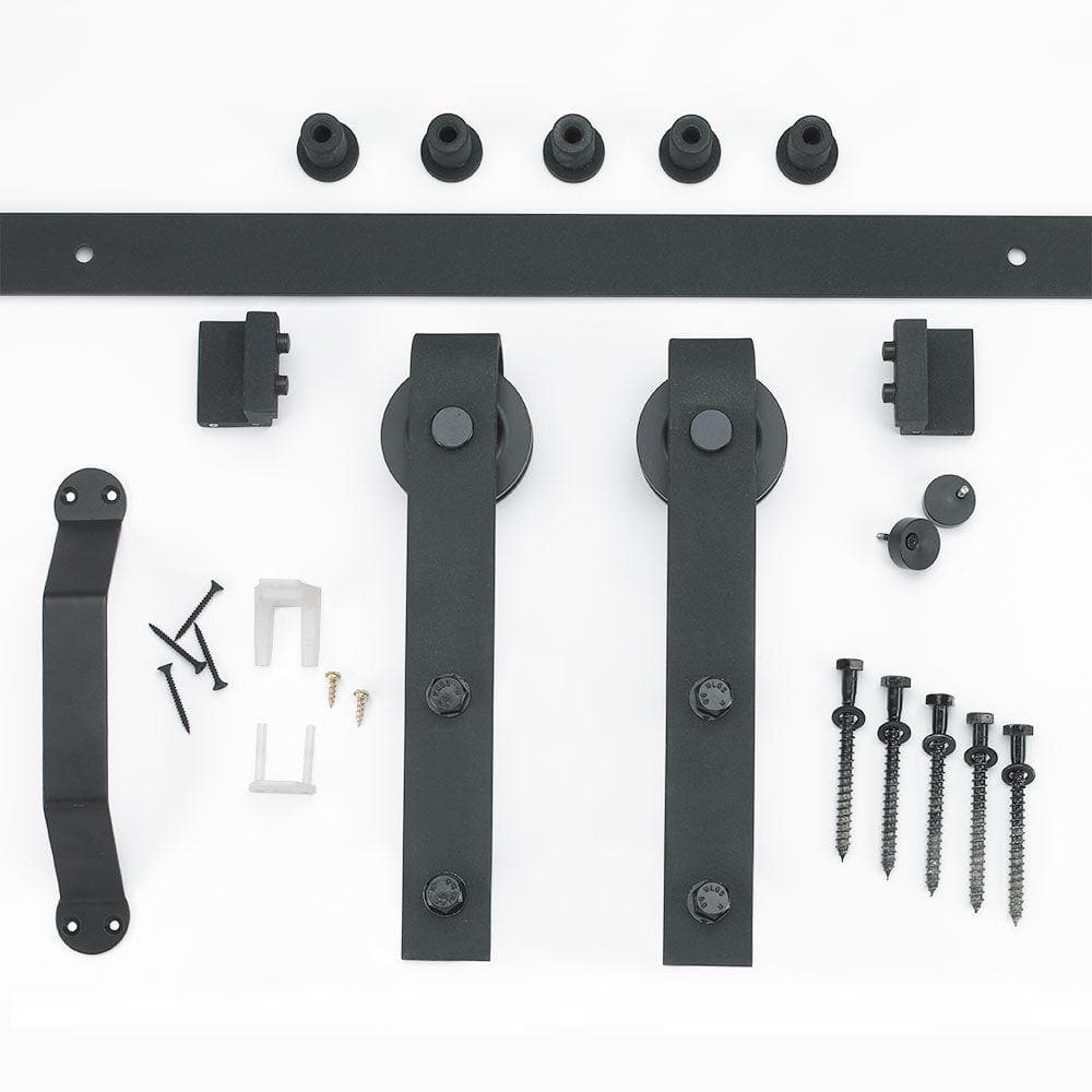 A: Door slab, black hardware track and hangers, handle set, fasteners, and installation instructions.