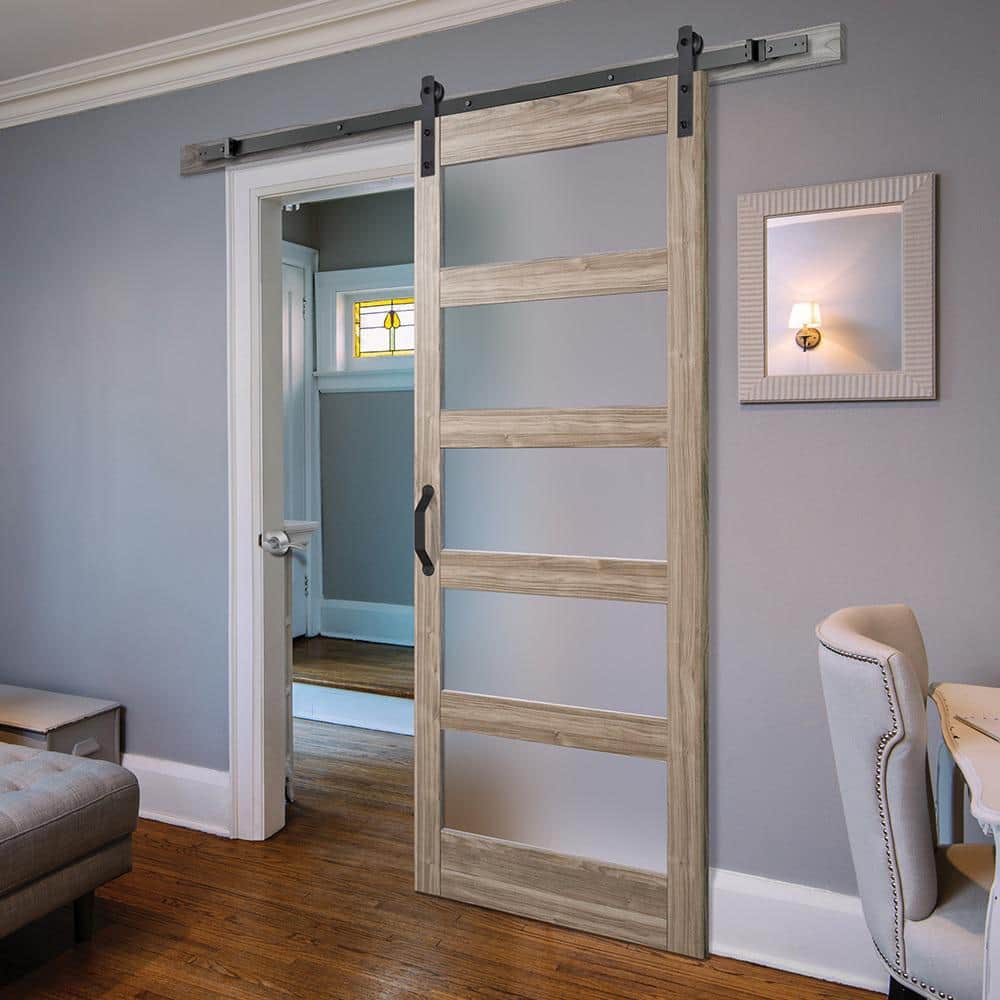 Elevate any room with this Masonite 5-Lite barn door featuring frosted privacy glass and an Ash Gray finish. The space-saving design glides smoothly on a black hardware track and includes all components for quick installation.