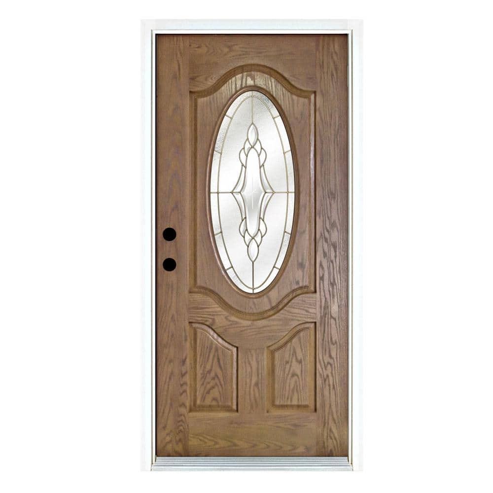 36 in. x 80 in. Medium Oak Right-Hand Inswing 3/4 Oval-Lite Andaman with Brass Stained Fiberglass Prehung Front Door