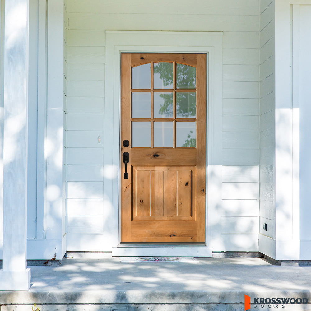 Krosswood 36 in. x 80 in. Rustic Knotty Alder Arch Top 9‑Lite Clear Glass with V-Panel Unfinished Wood Front Door Slab