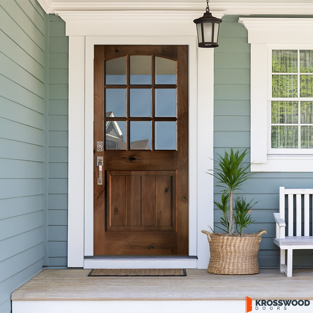 This arched 9‑lite door bathes your entry in a soft, golden glow while the knotty alder’s rich character grounds the façade with artisanal charm. The V‑groove lower panel adds textural depth, echoing the romance of a storied farmhouse. Pair it with matte black hardware and a limestone threshold for tailored contrast. It’s a refined staple that instantly elevates curb appeal and everyday living.