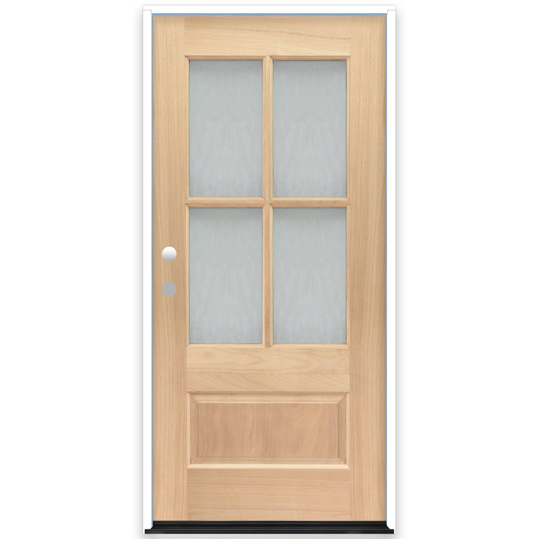 Elevate your home's entrance with the Creative Entryways Mahogany Front Door, featuring a solid hardwood core and textured glass for added privacy. This unfinished, right-hand inswing door combines durability with elegance, perfect for a sophisticated entryway.