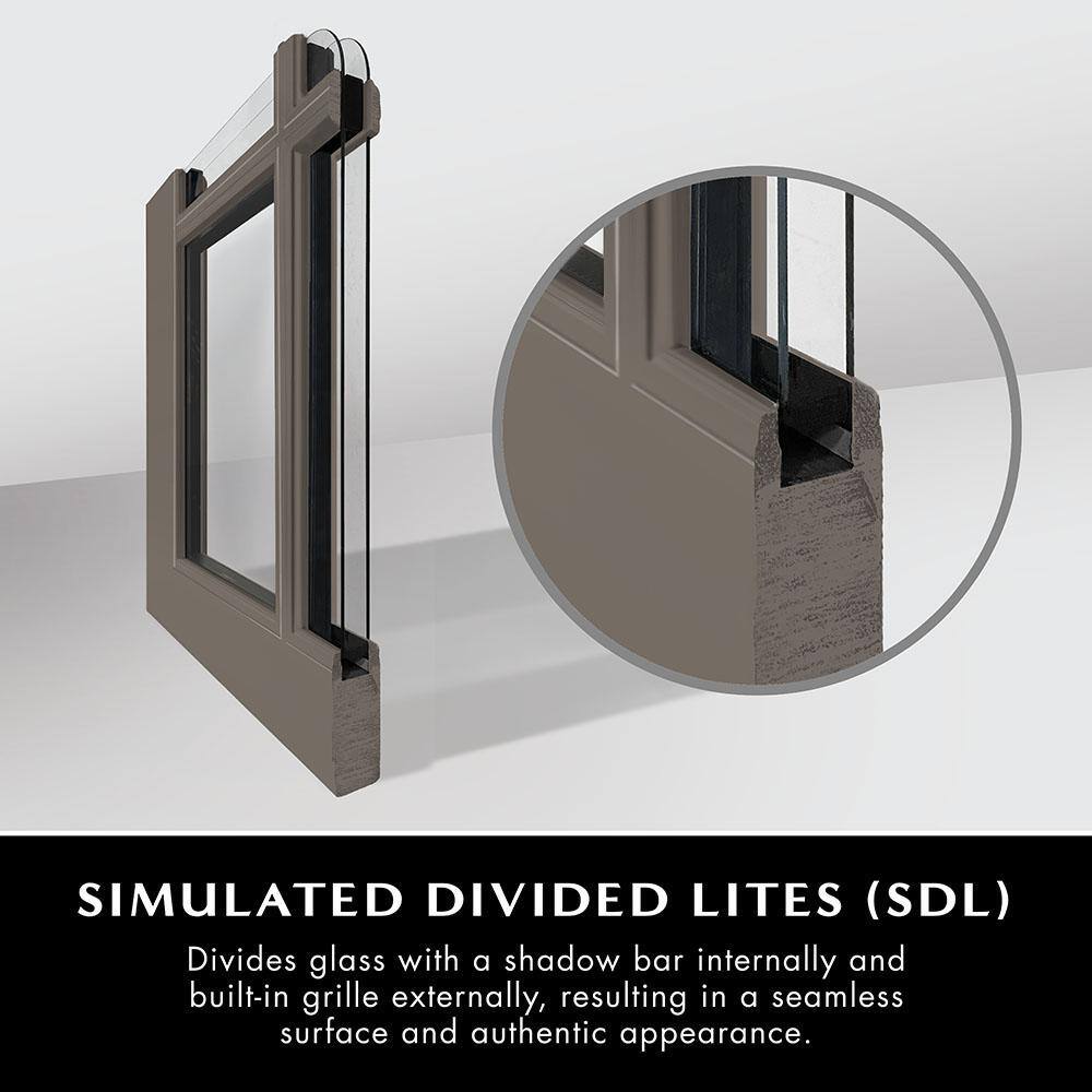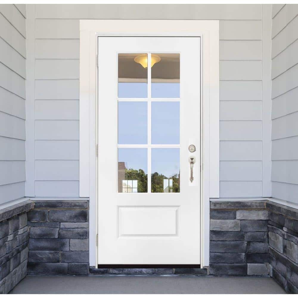 A classic 6-lite, 3/4 lite fiberglass front door prehung in a composite frame for durable, low-maintenance performance. Features double-glazed Low-E clear glass and right-hand outswing handing with white primed finish, ready to paint.