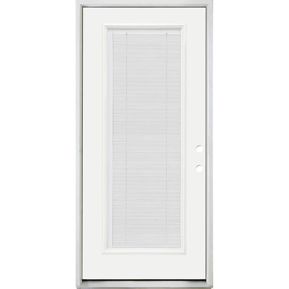 This Reliant series front door features a dent-resistant fiberglass slab with integrated clear full-lite dual-pane micro-blind glass for privacy and energy efficiency. Prehung in a primed 4-9/16 in. frame with high-performance weatherstripping and nickel hinges, it arrives ready to paint and install.