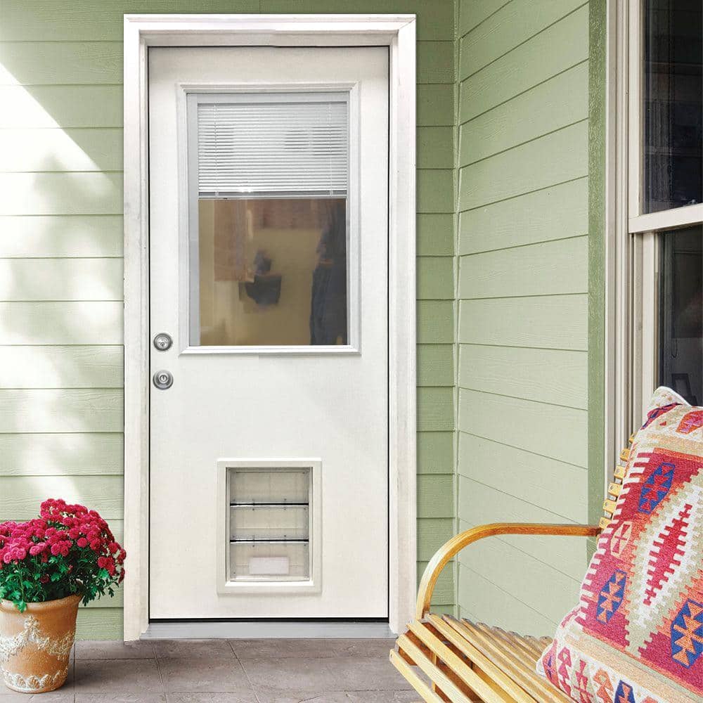 A durable, white-primed fiberglass exterior prehung door featuring clear Low-E glass with integrated mini-blinds and an extra-large pet door. Pre-hung in a 4-9/16 in. primed frame for easy installation and weather-stripped for a tight seal. Right-hand inswing with double lockset bore and nickel hinges.