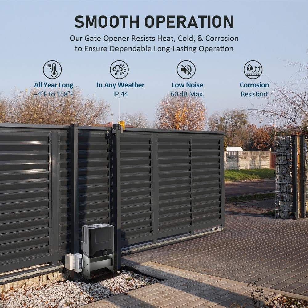 Experience ultimate security and convenience with the DOORADO Automatic Sliding Gate Opener, perfect for gates up to 4400 lb and 20 ft in length. Powered by a robust 750W all-copper motor, this opener kit offers safe, smooth operation at 42.5 ft per minute, complete with infrared sensors for added protection.