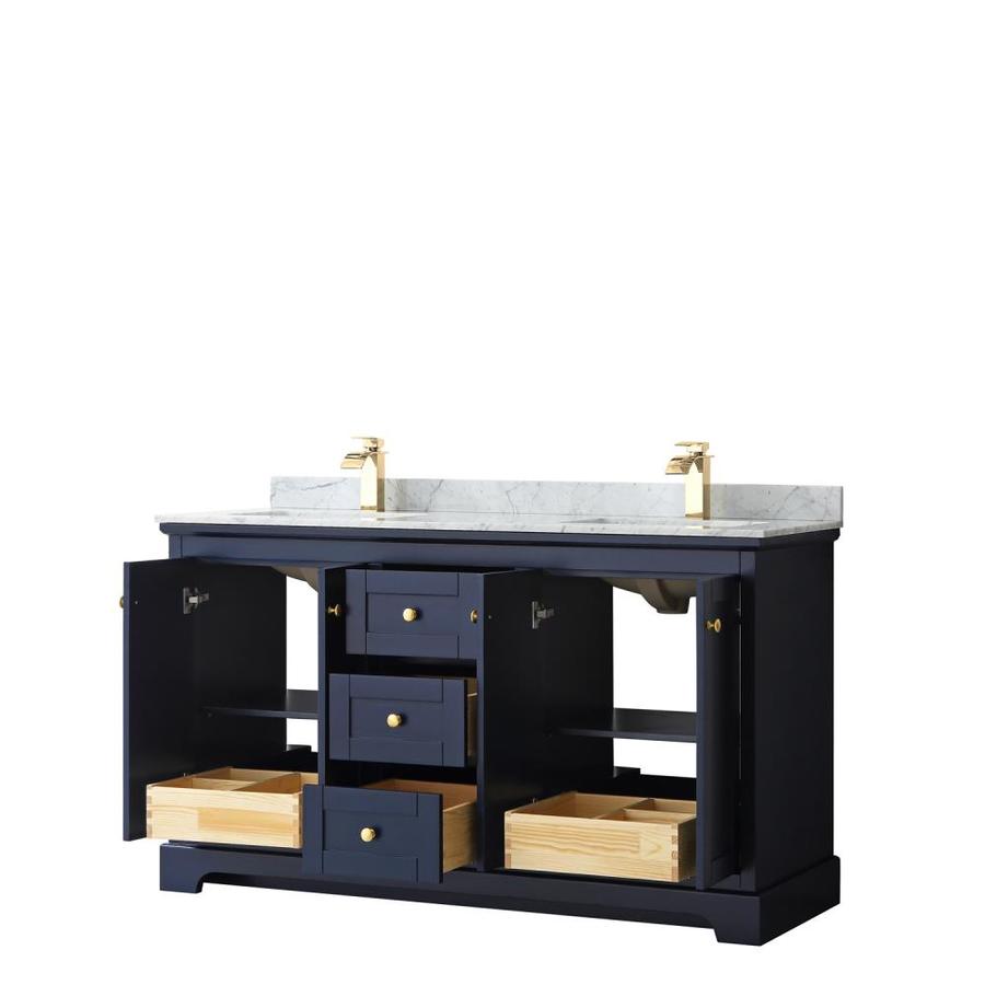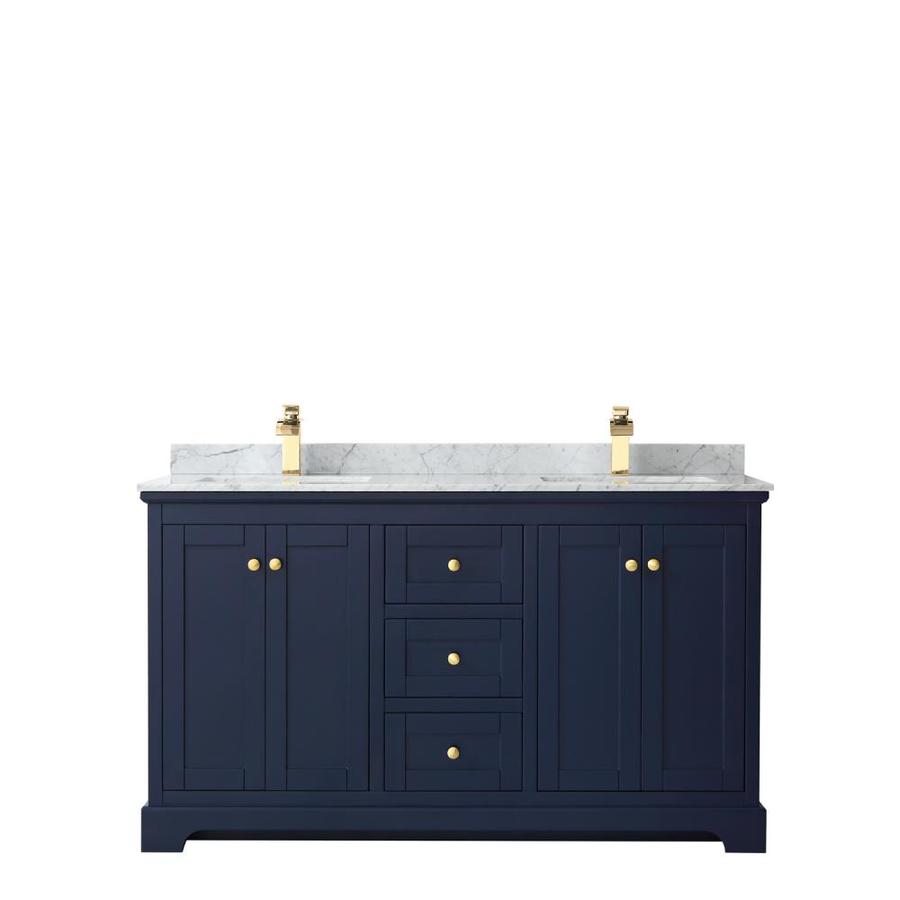 Wyndham Collection Avery 60-in Dark Blue Double Sink Bathroom Vanity with White Carrara Marble Top, Brushed Gold Hardware