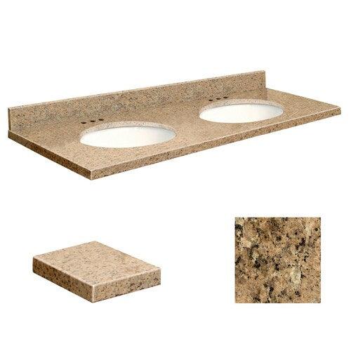 Elevate your bath with a pre-sealed Giallo Veneziano natural granite vanity top featuring two undermount oval white sinks. The 61-in x 22.25-in top includes a 4-in matching backsplash and is fabricated in the USA for lasting durability and stain resistance.