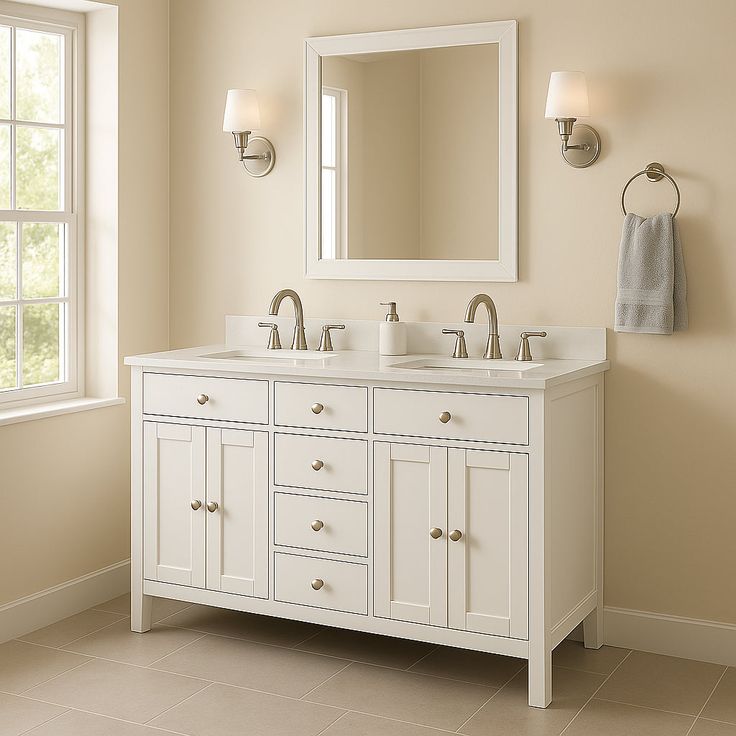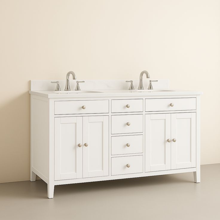 Transform your bathroom into a sanctuary of sophistication with the Austen 60-inch double vanity. Its shaker-inspired design and brushed nickel hardware exude timeless elegance, while the cultured marble countertop adds a touch of luxury. Style it with soft, neutral tones and plush towels to create a serene spa-like atmosphere. This vanity is not just a functional piece but a statement of refined taste.