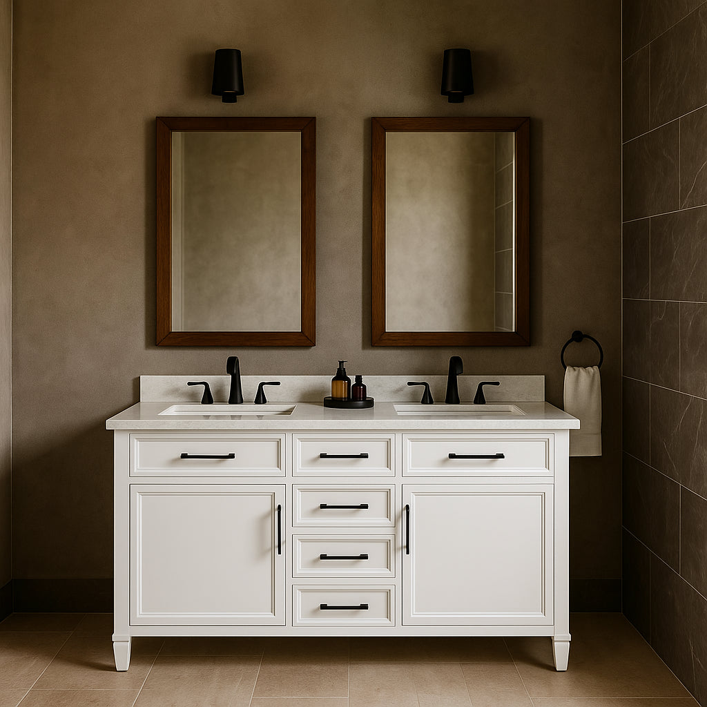 Transform your bathroom into a sanctuary of sophistication with the Aiken 60-inch double vanity. Its sleek white finish and engineered marble countertop exude timeless elegance, while the matte black hardware adds a touch of modern contrast. The thoughtful storage solutions, including adjustable shelves and deep drawers, ensure functionality meets style. Pair it with minimalist decor and soft lighting to create a luxurious retreat that combines practicality with aesthetic charm.