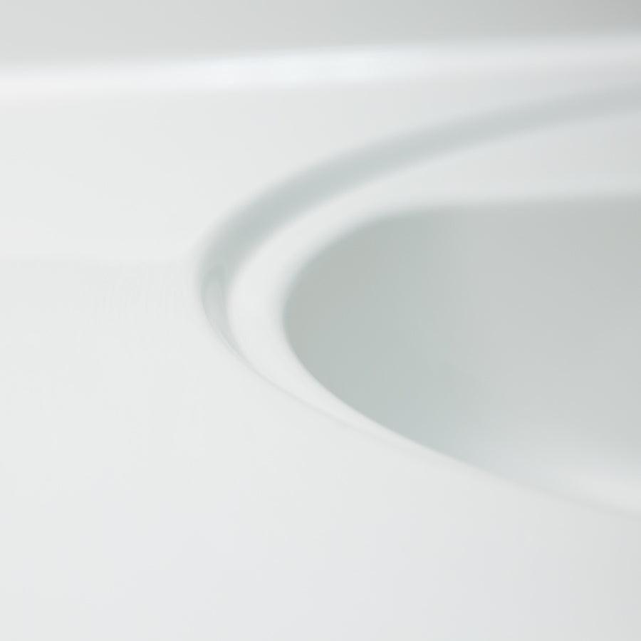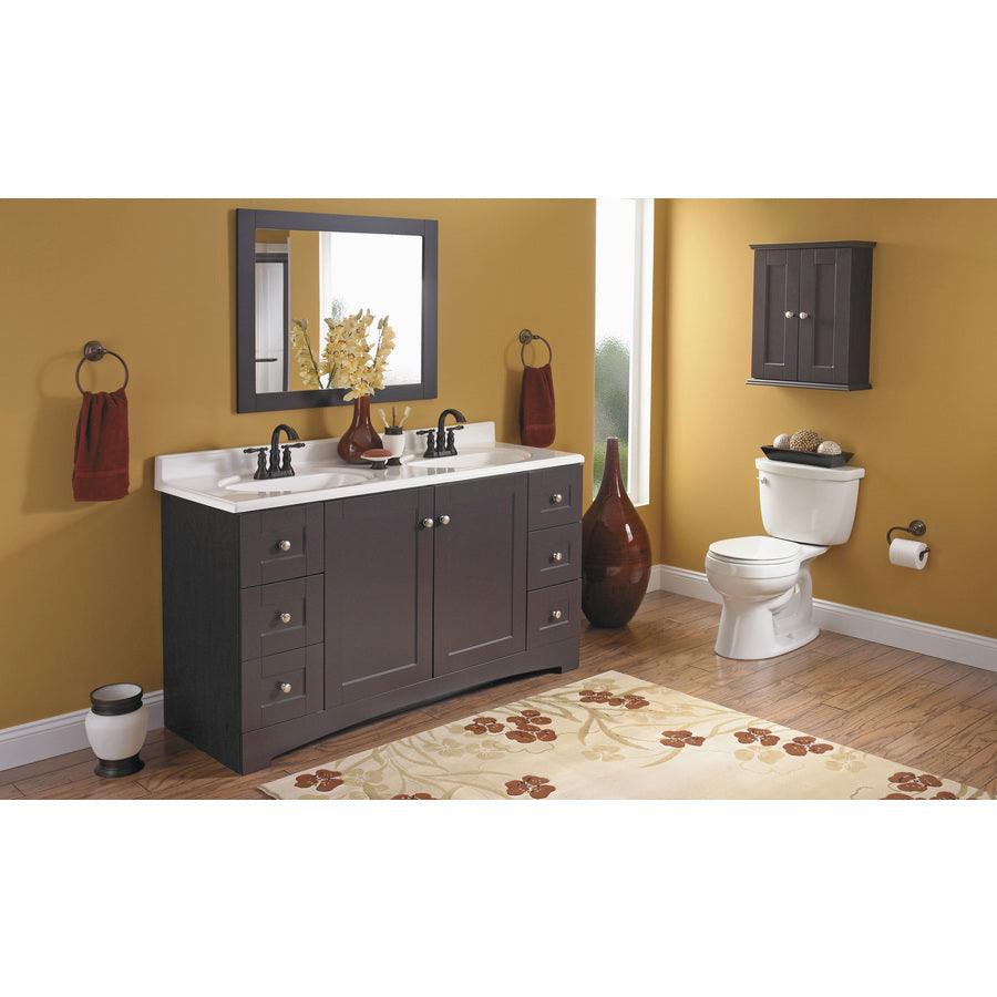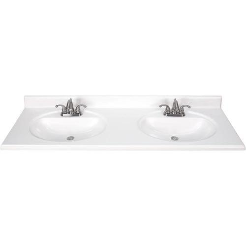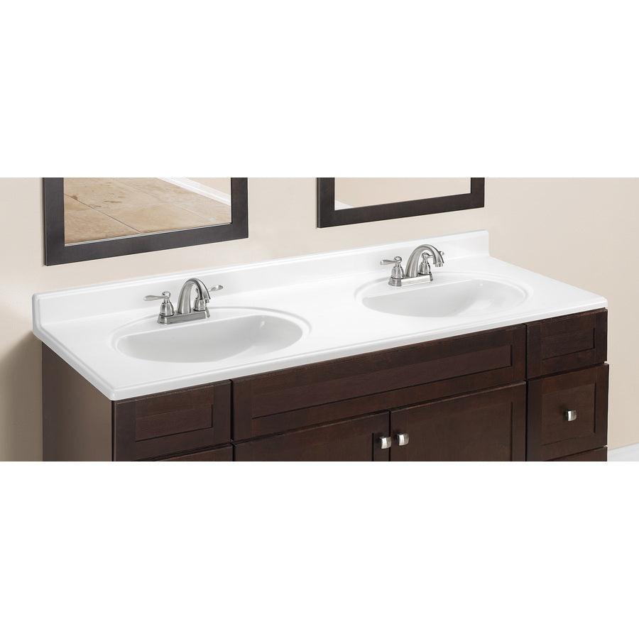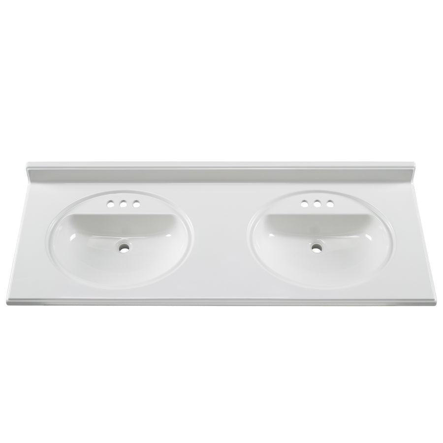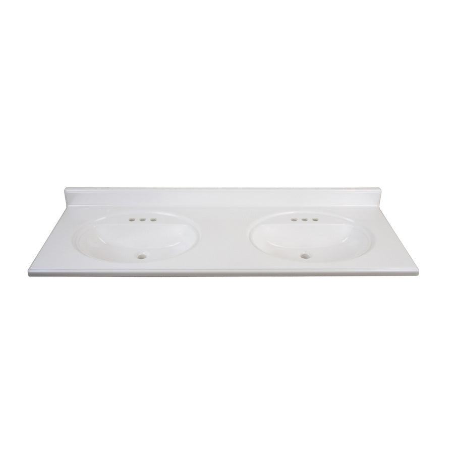 White premium cultured marble vanity top blends well with most bath decor 2 integral oval bowls for a seamless one-piece design 61-in W x 22-in D vanity top Pre-drilled for 4-in centerset faucets for easy installation (faucet sold separately) Integrated backsplash protects walls from water damage Ogee edge profile offers a classic and traditional look Fits 60-in W x 21-in D vanity cabinets Matching side splash available (sold separately)