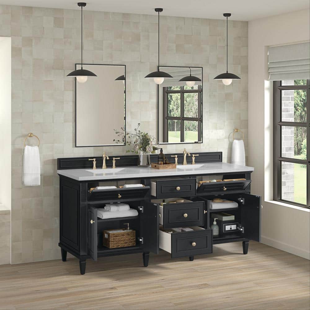 The Lorelai 72-inch Double Bath Vanity combines timeless design with modern functionality. Featuring a Black Onyx finish, champagne brass hardware, and a solid surface Arctic Fall top, this vanity offers elegance and durability. It includes ample storage with drawers, tip-outs, and interior shelving, along with USB/electric power outlets for added convenience.
