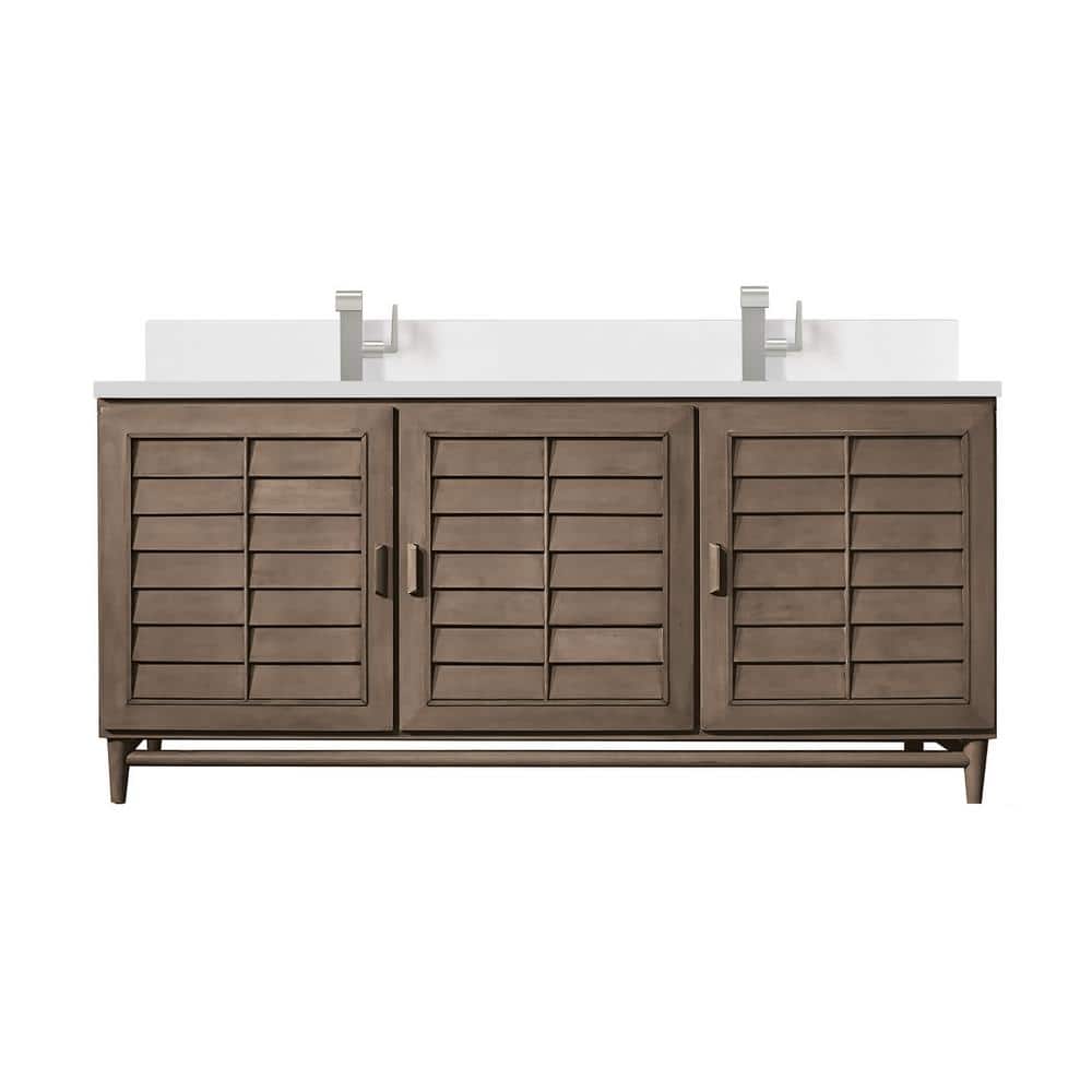 The Portland 72" Double Bathroom Vanity combines a whitewashed walnut finish with a durable White Zeus Quartz top. It features soft-close doors, ample storage, and a sleek design, making it a perfect addition to any bathroom.